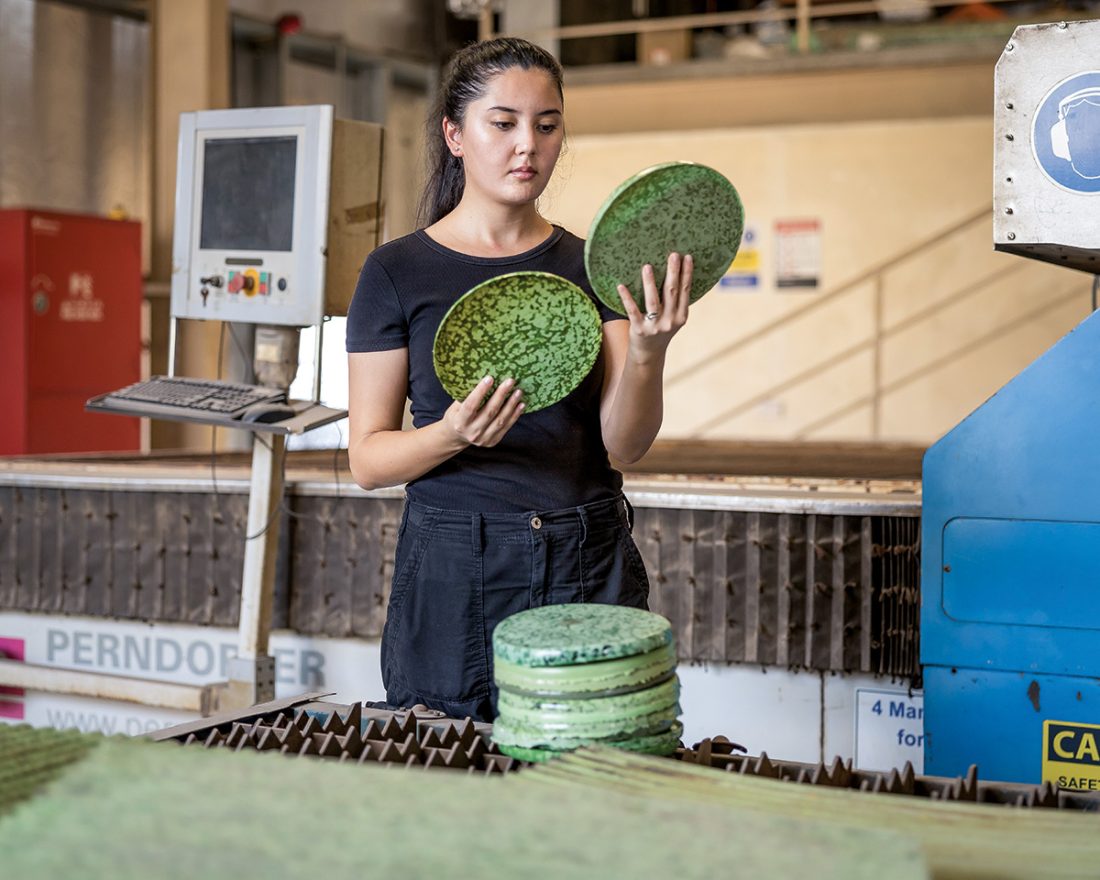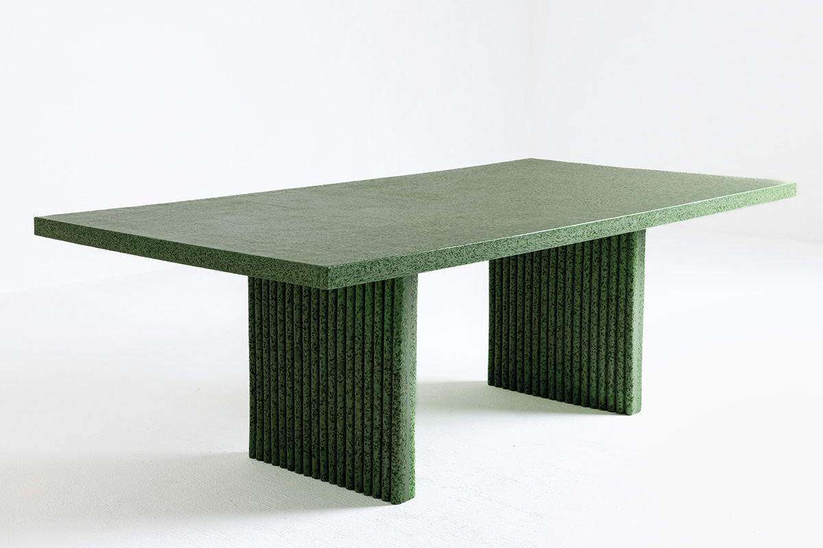 Designerul Chinara Darwish (Kazahstan) a acumulat experiență în inginerie mecanică după absolvirea studiilor la Universitatea Heriot-Watt (Dubai), înainte să își concentreze cercetarea și creativitatea pe găsirea unor soluții de reducere a deșeurilor și pe chestionarea materialelor viitorului și sustenabilitate. Toate aceste căutări și preocupări s-au materializat într-unul dintre proiectele sale recente, seria Alchemy, în care Chinara propune o masă de dining realizată din deșeuri LDPE (polietilenă cu densitate scăzută) provenite din industria navală și din construcții. Seria a fost prezentată la finalul lui 2023 în cadrul Dubai Design Week alături de creațiile unui colectiv de designeri sub umbrela programului Tanween by Tashkeel, un hub de design creativ din Emiratele Arabe. Având o capacitate de opt locuri, masa de dining își bazează corpul pe 193 kg de deșeuri de plastic LDPE care provin din geamanduri, flotoare de țevi de dragare, rezervoare de apă etc.