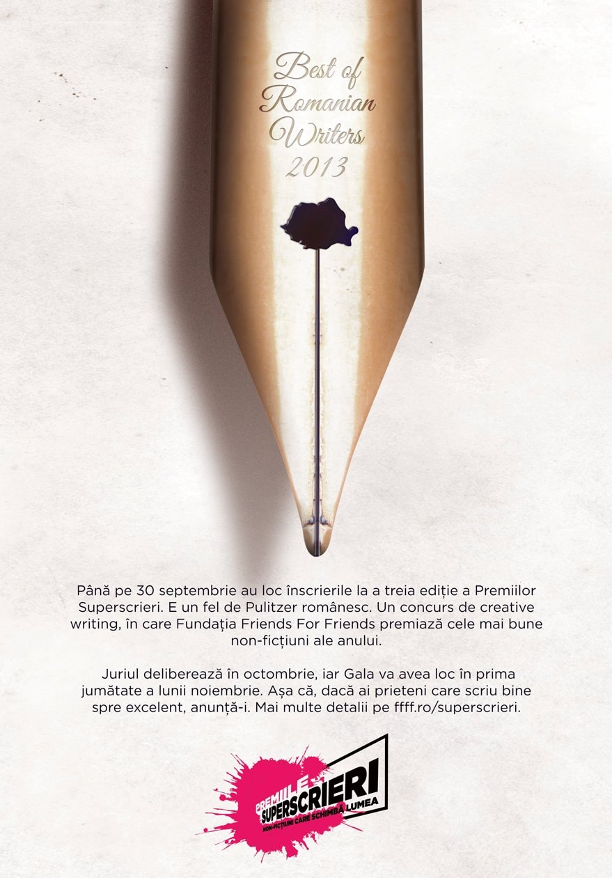 Pentru mai multe detalii despre Premiile Superscrieri, exploraţi http://ffff.ro/superscrieri/.