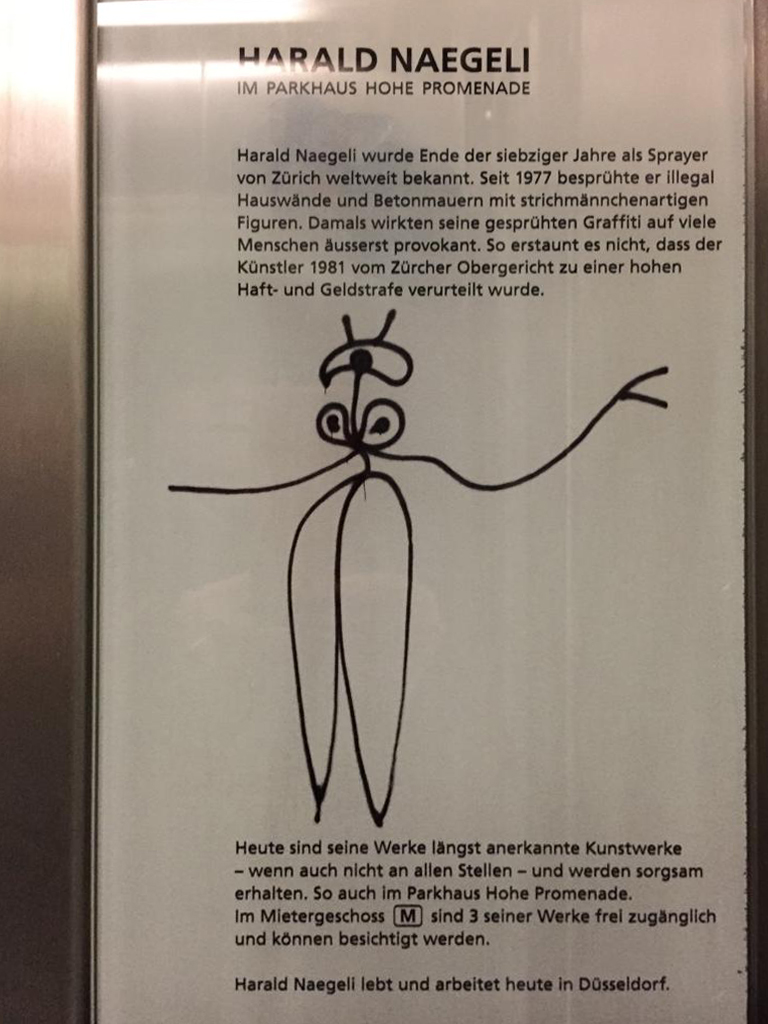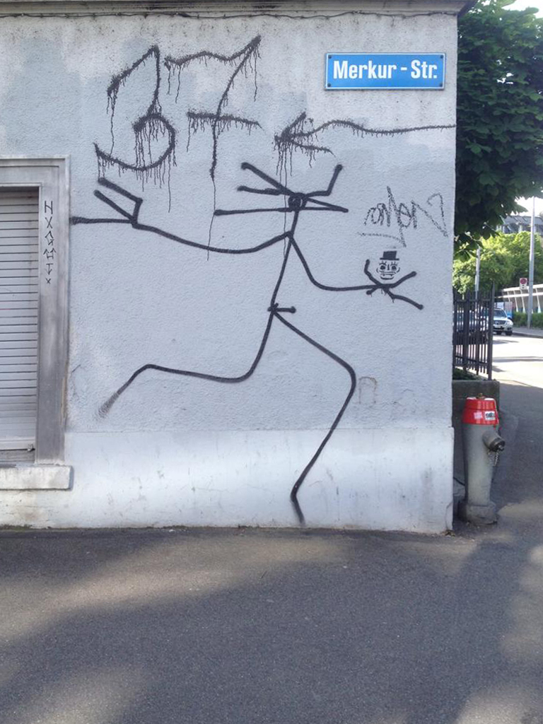 Artistul Harald Nägeli a devenit cunoscut publicului elvețian în 1977 după ce a șpreiat cu culoare neagră o serie de figuri filiforme pe clădiri publice și private din Zürich. A lucrat anonim, provocator, noaptea, într-o perioadă în care conceptele de graffiti și street art încă nu se născuseră și a declanșat un lanț de controverse ce continuă să atragă atenția publicului și în prezent.