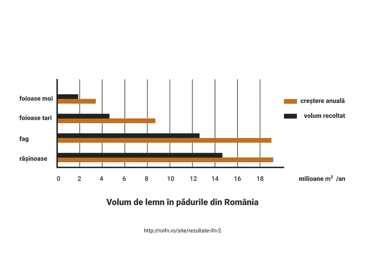 În pădurile din România cresc anual aprox. 58,6 mil. m3 de lemn12, din care este recoltat un volum total de 38,7 mil. m3