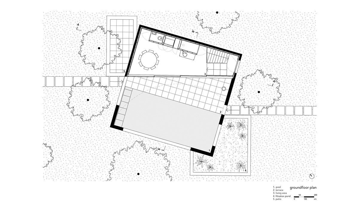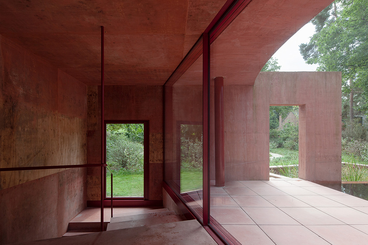 Construcția se așază în spatele curții unei case recent construite, unde peisajul natural s-a dezvoltat o perioadă fără intervenții. Pavilionul este amplasat în centrul grădinii, pe o axă dublă între casă și limitele terenului și e ridicat peste o plintă cu iz monumental, care separă senzorial mediul construit de cel natural — o separație, totuși, subtilă, care permite lejeritate în utilizare. Coaja de beton roșiatic propune un permanent dialog cu grădina, prinzând forme abstracte care par a reproduce un tipar de dezvoltare organică. Interiorul, moale și călduros, este ocrotit de exterior printr-o fereastră mare, glisantă, ce amintește de arhitectura casei. Un hortus conclusus (da, înseamnă grădină închisă) circular se decupează din placa ce acoperă pavilionul, decupând vegetația din peisajul construit și permițând luminii să pătrundă.