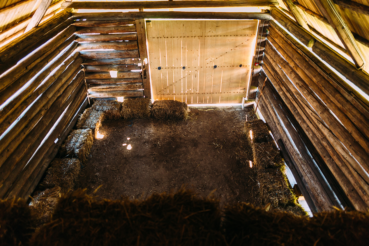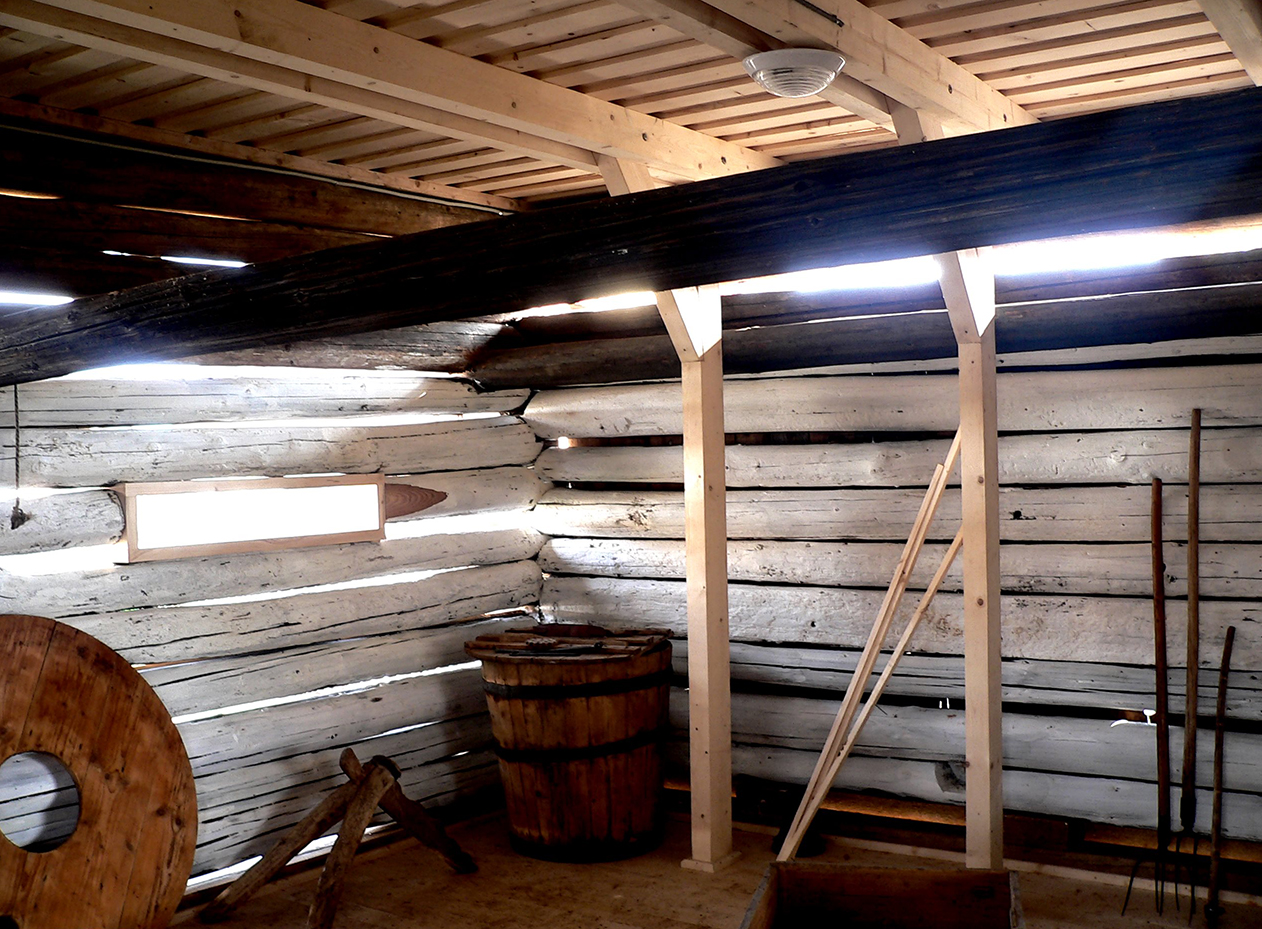 În acest sens, s-au păstrat cele trei grinzi originale ale tavanului de peste grajd, dar tavanul propriu-zis a fost ridicat pentru a asigura spațiul necesar. De asemenea, noul tavan este susţinut de o structură demontabilă. În spaţiul şurii s-a păstrat pardoseala din pământ, în timp ce, în afumătoria de odinioară s-a construit un cuptor tradiţional, dar cu semnalarea clară că este vorba de o intervenţie modernă.