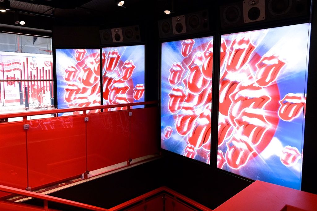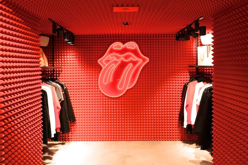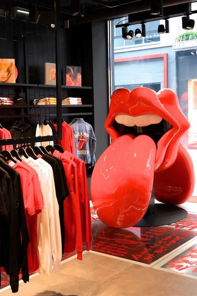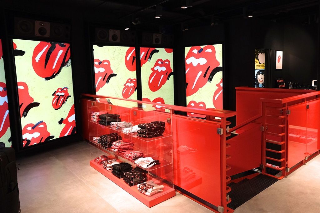 Ferestrele generoase ale magazinului încorporează o instalaţie soundwave ce redă primele acorduri ale emblematicei piese “Paint It Black”, din 1966, reinterpretate, la interior, sub forma unei captivante sculpturi din metal roşu. Podeaua este decorată cu versuri din piesele Stones, iar cabinele de probă conţin reproduceri ale copertelor unor albume legendare, precum „Exile on Main Street” (1972) sau „Some Girls” (1978), în timp ce cinci ecrane proiectează un documentar creat exclusiv pentru magazin, cu imagini din istoria trupei.