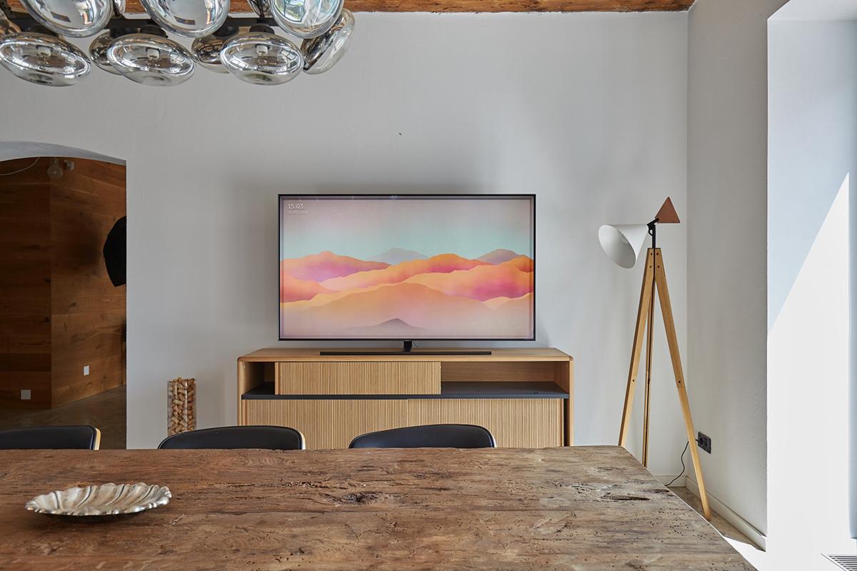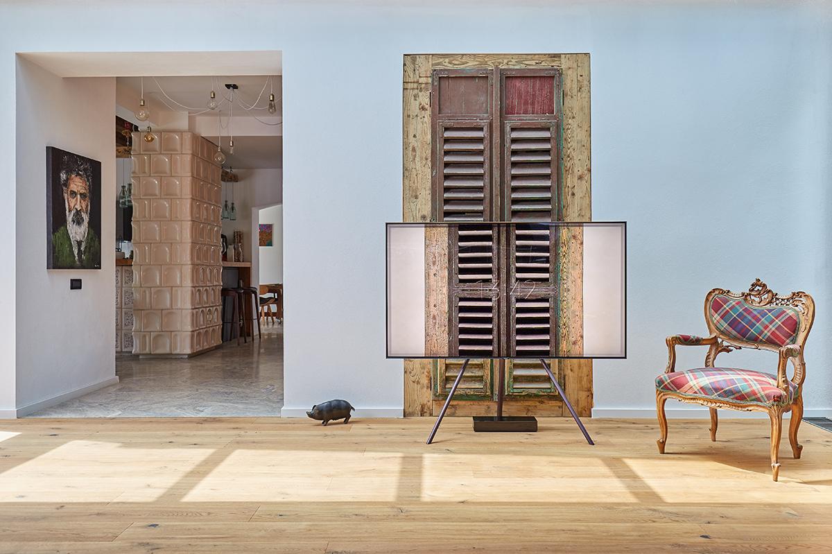 Constituită dintr-un volum existent și o extensie nouă, unite de o foaie de beton pliată în stil origami, element identitar cu un puternic impact vizual, casa prezintă spre stradă un discurs estetic modern ce protejează un interior caracterizat de jocuri abile de texturi, unde lemnul este prezent din abundență. În acest tip de context, este de dorit ca orice obiect adăugat interiorului să nu ascundă nimic din amenajare și, în schimb, să potențeze pe cât posibil detaliile de virtuozitate ale arhitecturii de interior. Prin urmare, alegerea televizorului Samsung QLED TV s-a dovedit a fi una evidentă deoarece, dincolo de funcția sa primară, de asigurare a entertainment-ului pentru familie, el constituie un obiect de design în sine. Mai mult, chiar și atunci când nu este folosit, acesta elimină total aspectul neplăcut de „bloc negru”, grație unei aplicații speciale ce îi conferă abilitatea cameleonică de a imita culorile și texturile oricărui tip de fundal, inclusiv al unui perete cu lemn aparent.