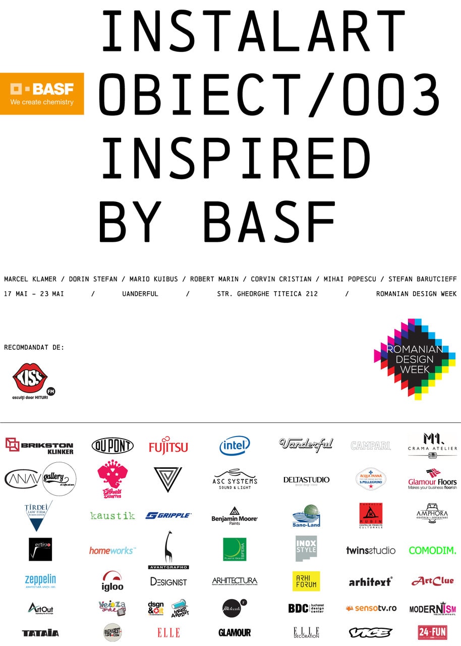 Instalart, asociația culturală care își propune să promoveze și să susțină artele tridimensionale (sculptură, obiect și land art), alaturi de BASF, lansează pe 17 mai în cadrul Romanian Design WEEK, Instalart/ Obiect/ 003. Inspired by BASF, eveniment ce va avea loc la parterul centrului de afaceri Ethos House.