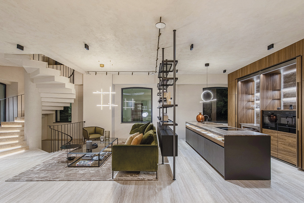 Parterul se deschide cu un living elegant și dinamic, configurat în jurul canapelei multifuncționale Marteen (semnată Van Duysen) și în care deja se disting fotoliile-vedetă Round D.154.5 de Gio Ponti. Povestea lor începe în anii ’50 și ilustrează o modernitate și o îndrăzneală a liniilor ce au fost percepute drept radicale la vremea aceea; azi, designul lor își păstrează intactă aura unei geometrii esențializate, perfecte. Alături, sufrageria dezvăluie masa Diamond, a Patriciei Urquiola, premiată la Red Dot Design Award în 2005 — o structură masivă și delicată deopotrivă, memorabilă prin picioarele sculpturale ce trimit la origami.