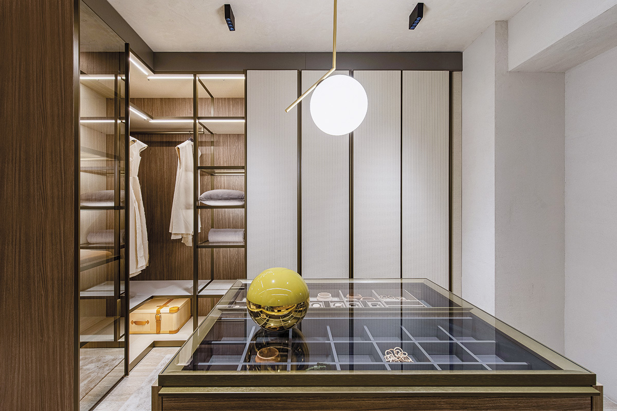 Călătoria Molteni&C continuă la următorul etaj, pe o impozantă scară în spirală ce unește cele două niveluri și anunță un nou teritoriu, mai misterios — zona de noapte —, nu înainte de a traversa o nouă propunere de living, unde am testat fotoliul Kensington de Dordoni, întruchipare ideală a confortului și relaxării. Dormitorul scoate la iveală un generos dressing (Gliss Master), conceput ca un loc călduros, intim și tăcut al bucuriei de a ordona și păstra.