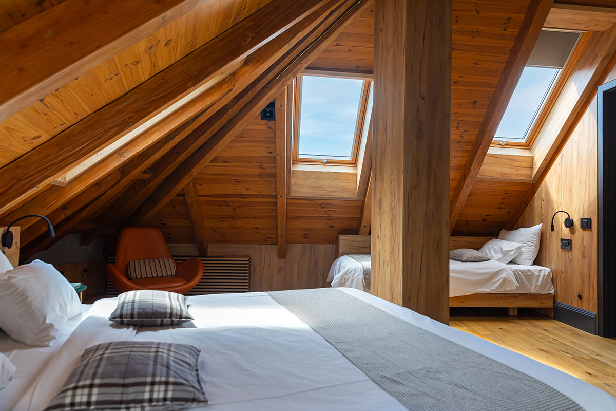 Pe lângă faptul că permit luminii naturale să pătrundă generos în camere, ferestrele VELUX sunt echipate cu rulouri opace care oferă intimitate și posibilitatea de a regla intensitatea luminii în funcție de preferințele fiecărui oaspete. Astfel, spațiul devine un sanctuar al confortului, perfect pentru relaxare indiferent de momentul zilei.