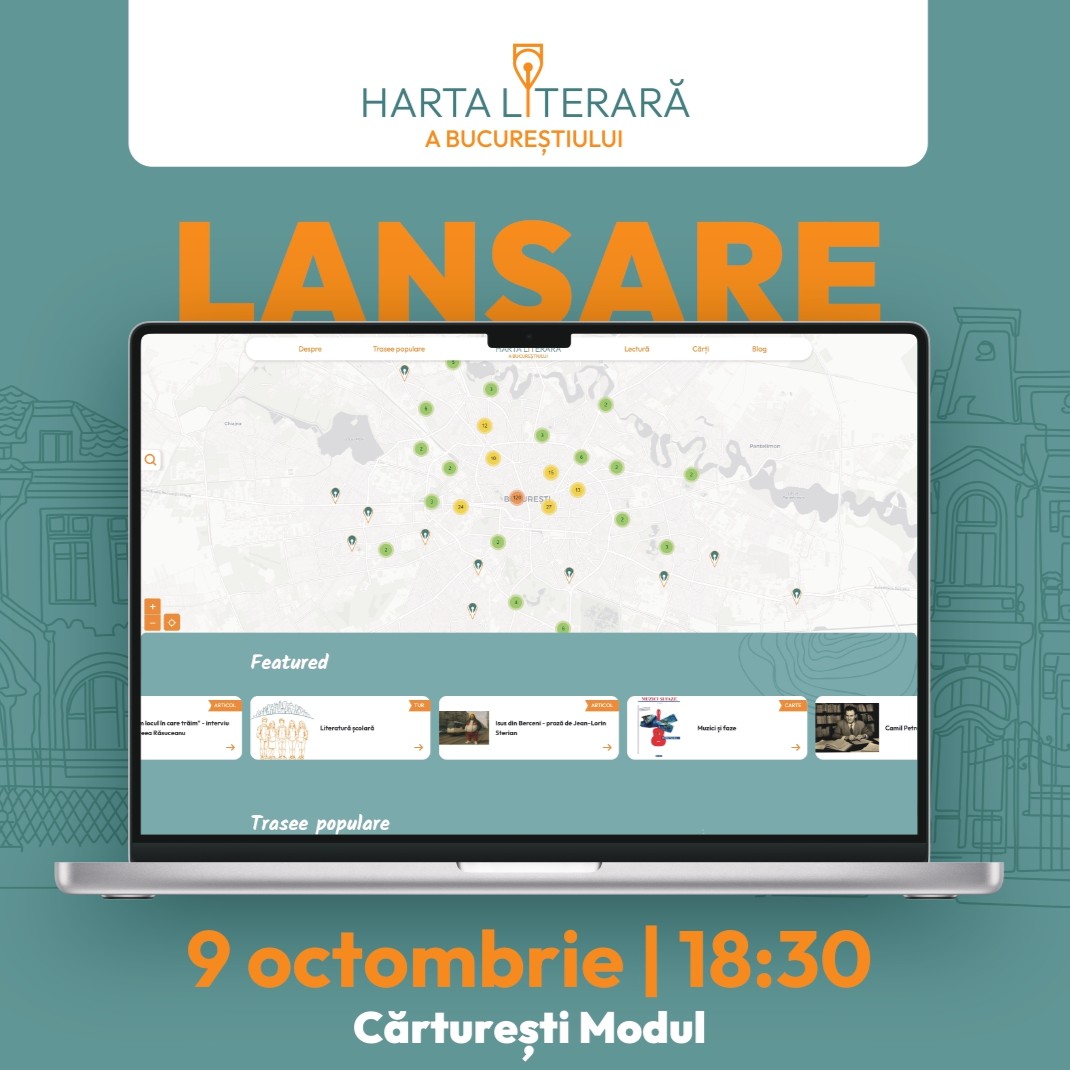 Joi, 9 octombrie, de la ora 18:30, la Cărturești Modul, are loc evenimentul de lansare al proiectului Harta Literară (www.hartaliterara.ro), prima hartă interactivă a locurilor care apar în cărți, un proiect de geografie literară, care unește cărțile cu orașul.