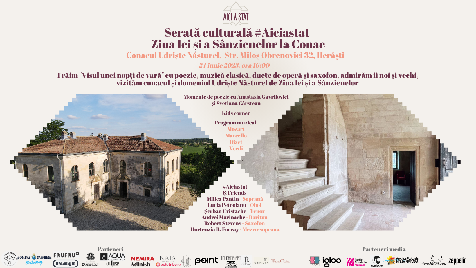 „24 Iunie este o data specială pentru patrimoniul cultural intangibil din 2 perspective: sărbătorirea Drăgaicei sau a Sânizenelor are rădăcini adânci în mentalul colectiv românesc și marchează și celebrarea iei sau a cămașii cu altiță, care se află de anul trecut pe Lista Patrimoniului Intangibil al Umanității UNESCO. Prin proiectul #Aiciastat promovăm patrimoniul cultural și am ales această dată de referință pentru un eveniment extraordinar la un conac istoric ridicat de logofătul Udriște Năsturel în 1620. Deoarece Udriște Năstural a fost cărturar și poet, noi vom face arc în timp și vom celebrea și poezia alături de 2 poete contemporane excepționale: Svetlana Cârstean și Anastasia Gavrilovici. Vom prezenta ii, vom admira artă, vom răsfoi cărți, iar seara va fi încununată cu un recital regal cu arii de operă, cu piese de Mozart, Marcello, Bizet sau Verdi. Ne bucurăm că deschidem alături de partenerii noștri o nouă etapă pentru Conacul Udriște Năsturel, care va găzdui evenimente culturale ca un nucleu al patrimoniului cultural de referință la sud de București”, declară Ana Rubeli, Președintele Asociației culturale Aici a stat.