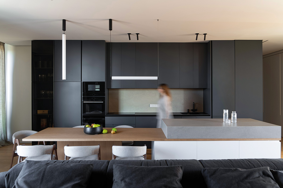 În zona de zi, unde comunică liber livingul, diningul și bucătăria, atmosfera este una sobră și rafinată. Două sunt elementele de impact care modelează și dau caracter spațiului: plafonul cu lamele de lemn care aduce ritm și fluiditate și desenul în cărbune reprezentând un samurai – simbol al valorilor și pasiunilor beneficiarilor. Dorința de a fi o casă primitoare se traduce prin unirea mesei cu insula de bucătărie și, la nivel general, prin cromatică și materiale: accente naturale de lemn, alb cald și gri antracit.
