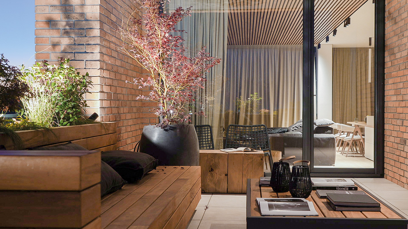 Legătură firească cu exteriorul, terasa prelungește atmosfera din interior, prin materialele selectate, cum ar fi lemnul exotic de origine braziliană din care este realizat mobilierul, ales grație rezistenței sale la umiditate. Corpurile de iluminat pun în evidență discret arțarii japonezi, contribuind la jocul de lumini și umbre care se profilează pe pereții din cărămidă și aducând un strop de magie.