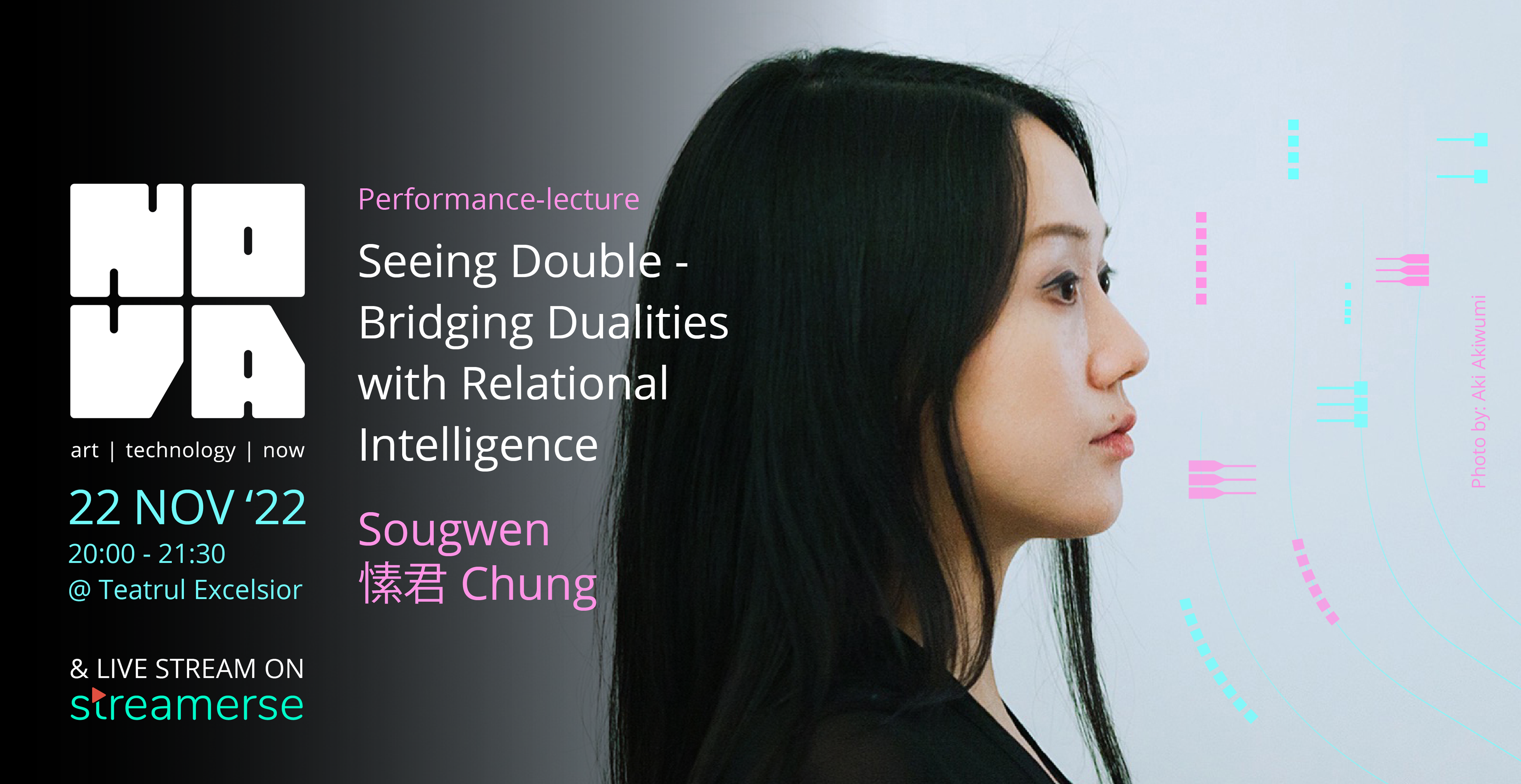 Seeing double – bridging dualities with relational intelligence este tema acestui performance-lecture care speculează viitorul alternativ al relațiilor dintre oameni și mașini, adresând întrebarea: unde se termină „AI” și unde începe „noi”? În timpul evenimentului, Sougwen va explica abordarea ei artistică și va demonstra, cu ajutorul unui conținut audio-video captivant, poetica privind colaborarea umană și non-umană prin explorarea diferitelor moduri de percepție și de desenare între artist și mașină, organic și sintetic, improvizațional și computațional.