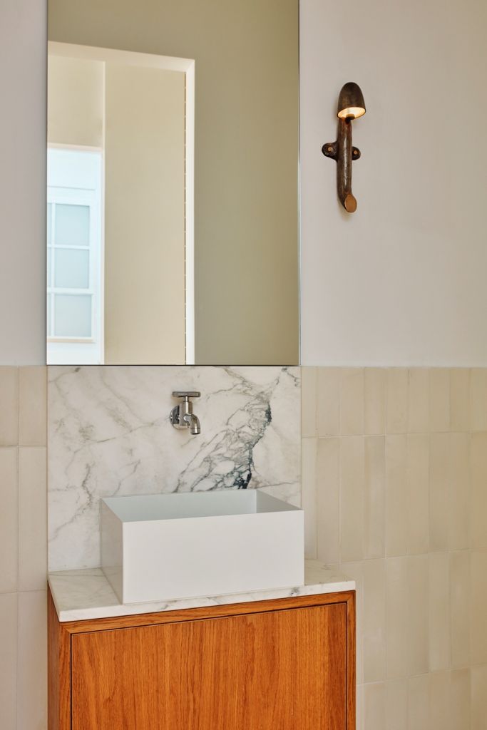 De-a lungul coridorului, o serie de uşi glisante conduc către camera de oaspeţi, dressing şi băi, destinaţia finală fiind dormitorul matrimonial pe dublă înălţime, cu plante din abundenţă şi o supantă unde o cadă de sine stătătoare este amplasată sub un luminator generos. În interiorul băilor, gresia respectă modelul în spic al podelelor din celelalte încăperi. Lemnul este prezent şi aici, alături de obiecte din marmură şi oglinzi înalte.