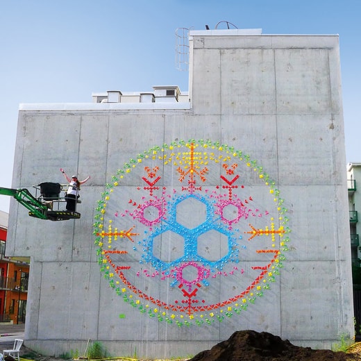 Mademoiselle Maurice a dus instalaţiile sale de origami urban în Franţa, dar şi în Vietnam, Singapore, Japonia sau Suedia, înviorând străzi, calcane sau spaţii expo­zi­ţionale cu sute şi sute de forme de hârtie, pliată sub diferite forme inspirate din natură – de la hexagonul fagurelui de miere până la silueta cocorului. Senină şi mul­ticoloră în aparenţă, arta semnată Mademoiselle Maurice ridică, de fapt, o se­rie de întrebări la adresa naturii interacţiunilor umane şi a mediului. (Şi) din acest motiv, artista de origine franceză, în vârstă de 29 de ani, absolventă a Facul­tăţii de arhitectură din Lyon, a fost invitată, anul trecut, în cadrul Festivalului de artă urbană Artscape din Malmö, Suedia, pentru a acoperi unul dintre calcanele oraşului cu o compoziţie de mari dimensiuni, în culorile curcubeului. www.mademoisellemaurice.com