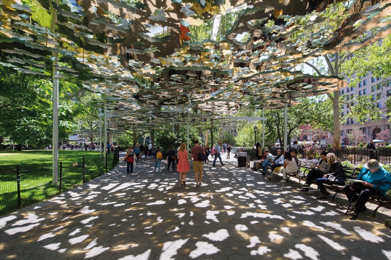 Începând cu 1 iunie 2015 şi până primăvara viitoare, Madison Square Park radiază o lumină aurie ce vine de la noua instalaţie semnată Teresita Fernández. Fata Morgana este un miraj orizontal grandios, lung de mai bine de 150 de metri şi compus din 236 de panouri cu finisaj de oglindă şi cu forme organice, rotunjite, sugerând cumva frunzele de stejar – o lucrare „inspirată şi realizată special pentru această locaţie”, după cum afirmă artista. „Conceptul meu a fost acela de a inversa noţiunea tradiţională de sculptură outdoor, adresându-mă mai degrabă trecătorilor decât celor care stau pe o bancă şi admiră o piesă centrală, statică. Planând peste alee, Fata Morgana devine un miraj luminos care distorsionează şi, în acelaşi timp, îmbogăţeşte peisajul.” Madison Square Park este un spaţiu verde de relaxare, dar şi de trecere, primind, zilnic, aproximativ 50 000 de vizitatori. www.madisonsquarepark.org/things-to-do/calendar/mad-sq-art-teresita-fernandez