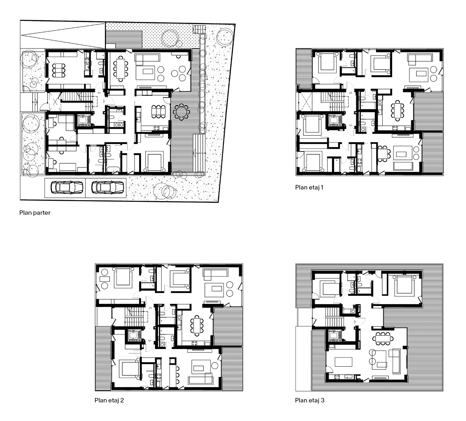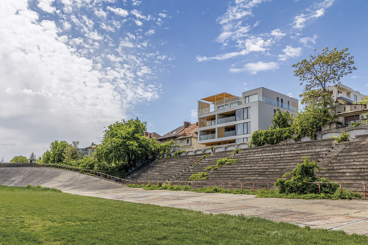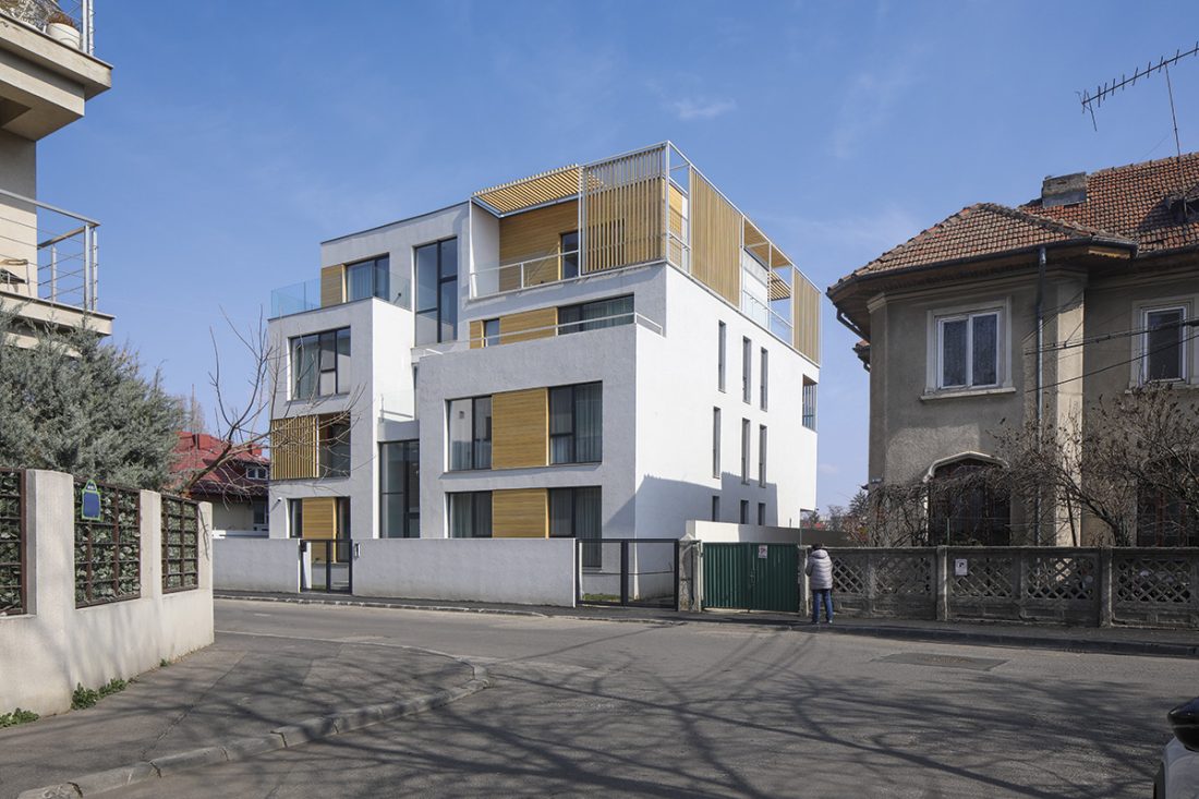 Un bloc masiv, paralelipipedic devine rezultatul reglementărilor urbanistice (de altfel singura sau cea mai limpede formulă de abordare a unui teren de dimensiuni reduse), pe care arhitecții îl sculptează prin retrageri succesive pentru a forma terase și logii ce fragmentează prezența noii arhitecturi. Dacă frontul stradal și lateralele volumului au fost definite de retragerile reglementate, partea din spate se deschide complet către Velodrom pe toată lungimea prin terase generoase care permit o panoramă neobstrucționată a orașului. Pergole și riflaje metalice fine și placări de lemn îmbogățesc fațada discretă, în timp ce vitrajele generoase descompun volumul compact și oferă, din stradă, o dimensiune locuirii interioare. Cele 7 apartamente diferă ca planimetrie și suprafață, dar împărtășesc o viziune comună asupra locuirii – o mediere sensibilă și firească între interior și exterior.