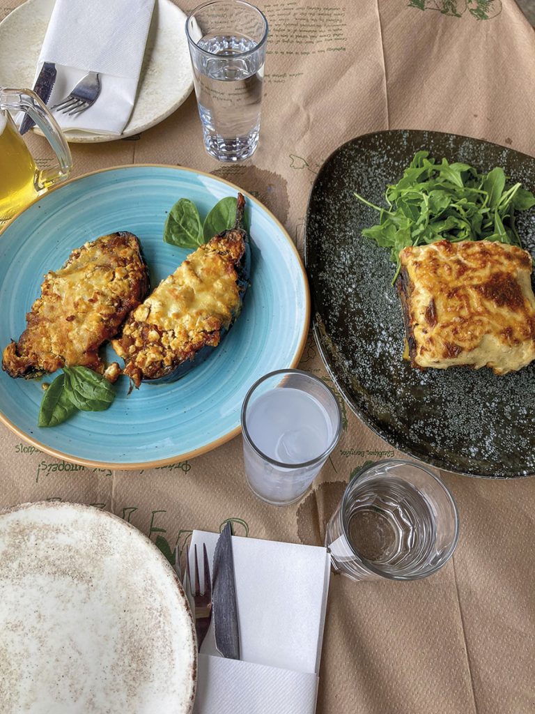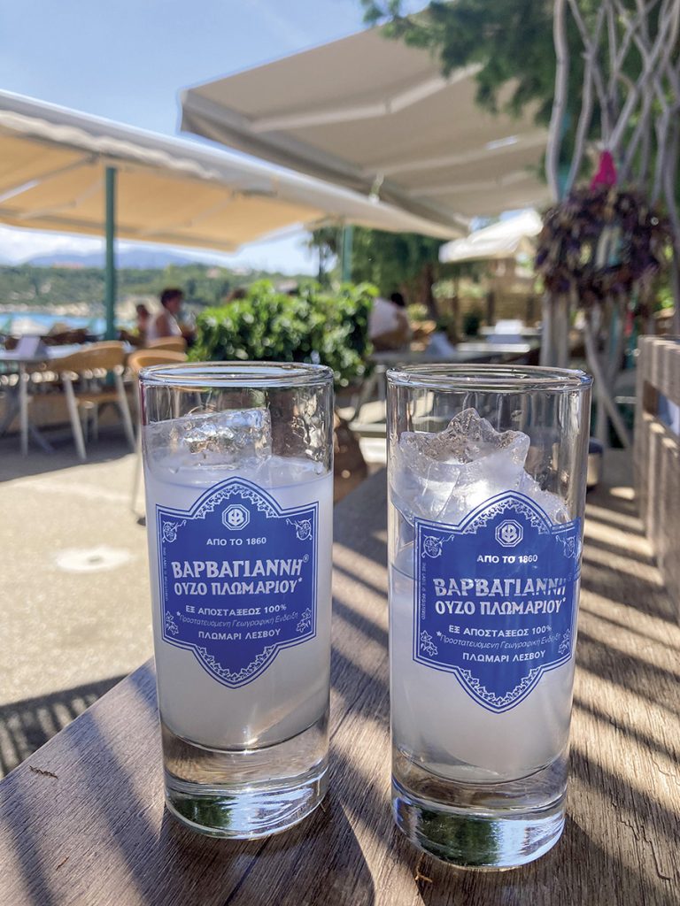 Ouzo (obținut pe același principiu al distilării strugurilor) se savurează sub răcoarea cuburilor de gheață și combinat cu apă, înghițitură cu înghițitură, spre exemplu, la taverna din centrul unui sat de munte, cum ar fi Vamos, în compania unei farfurii cu meze, în timp ce bătrânii locului încing un joc de cărți. Sau la un prânz târziu, pe drum, între o plajă ascunsă și o mânăstire calmă, în timp ce frunzele măslinilor se unduiesc ușor, iar masa se umple cu brânză saganaki, musaca, tzatziki și salate. Iar cine crede că ouzo nu merge și la apus, nu s-a așezat probabil la terasa boutique hotelului Alcanea, în portul venețian din Chania pentru a vedea cum soarele apune dincolo de far. Indiferent unde vă prind drumurile la o masă pe care apar și o sticlă de raki ori ouzo, nu uitați să ciocniți înainte de a savura.
