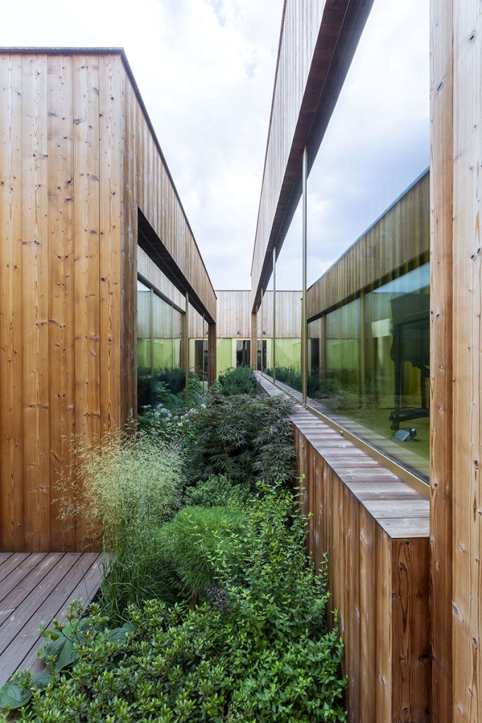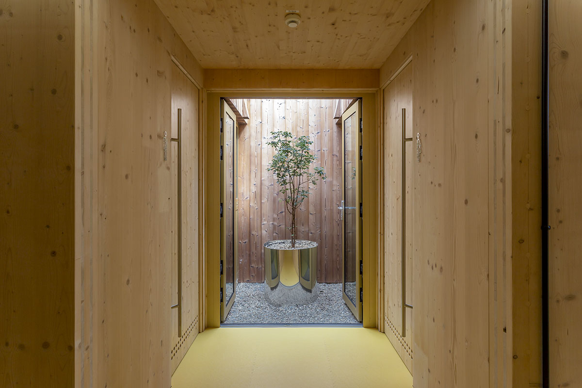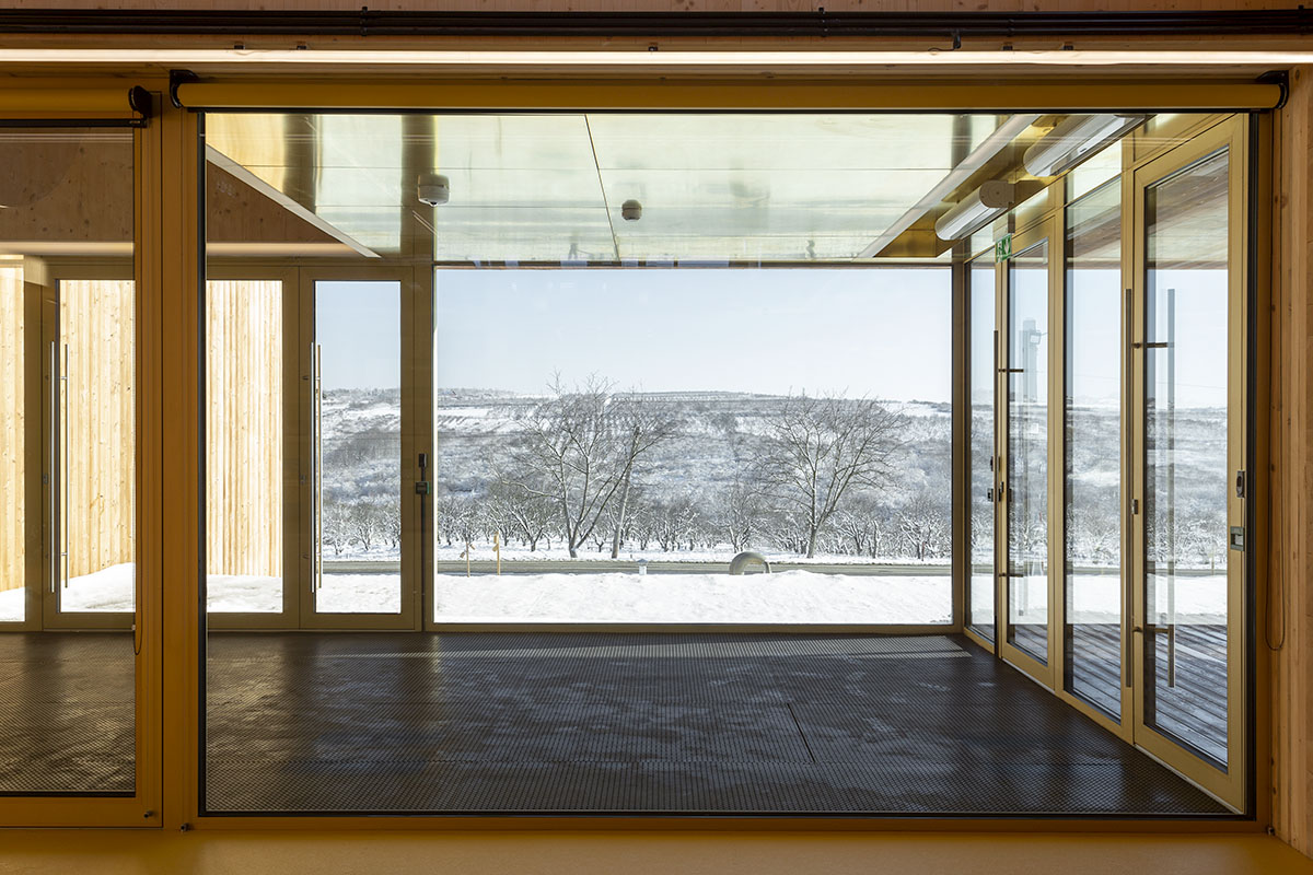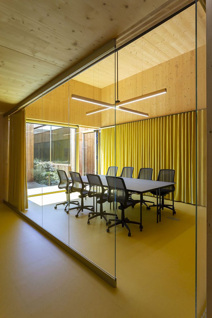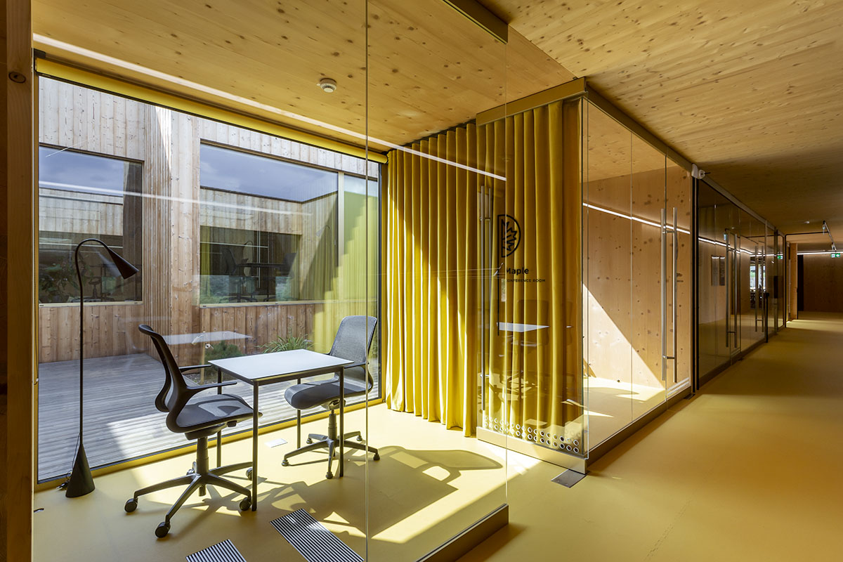 Spațiile interioare sunt conectate vizual cu exteriorul, intensificând pitorescul locului în care se amplasează. Utilizarea CLT-ului permite tocmai realizarea unei structuri flexibile și rapid de pus în operă, cu un impact redus asupra mediului. Spațiile interioare au deschideri mari, potențând caracterul deschis și modular al clădirii.