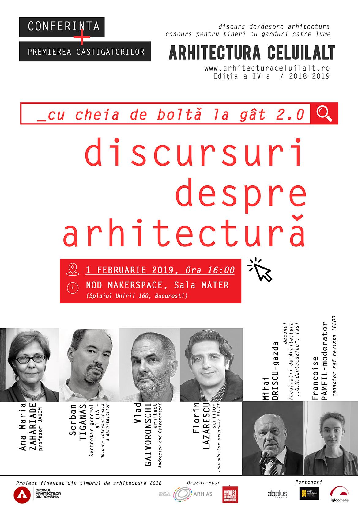 "Discursuri despre arhitectură" e titlul unei întâlniri gândite ca o masa rotundă dedicată ideii de a scrie în acest domeniu dezideratul fiind transformarea dezbaterii într-o discuție ca între prieteni. Concursul din acest an, intitulat re:FORMA, este a patra ediție a proiectului de comunicare și exprimare în