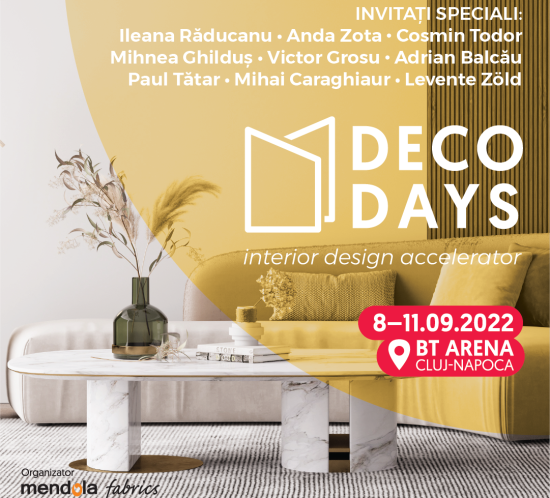 Anterioară Următoare Deco Days 2022 a avut loc între 8 și 11 Septembrie, la BT Arena în Cluj-Napoca. Evenimentul dedicat iubitorilor de design s-a bucurat de peste 3000 de vizitatori din toată țara. Evenimentul a găzduit masterclass-uri, prezentări, lansări de colecție și workshopuri susținute de experți în