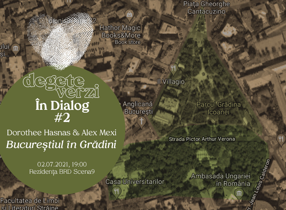 02 iulie, 19h00 – DEGETE VERZI ÎN DIALOG#2: Bucureștiul în Grădini Invitați: Dorothee Hasnaș în dialog cu Alex Mexi În București au fost mai întâi grădini utilitare (grădini de legume, livezi și vii), apoi parcuri publice și grădini amenajate pentru „case (mai) înstărite”. În zona de interes
