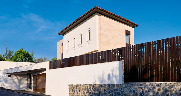 În cazul acesta, arhitectura contemporană se constituie într-un masiv ecran alb, pe care se proiectează o casă cu imagine, proporţii şi detalii tradiţionale. Ansamblul este format din două corpuri de clădire, dispuse în L, ce adăpostesc 10 camere.
