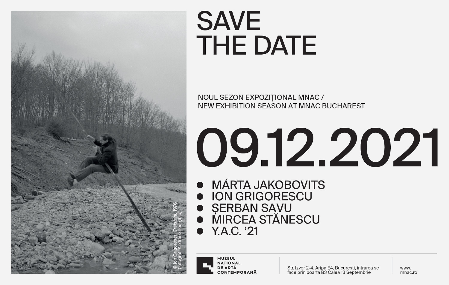 MNAC lansează, fără vernisaj, noul sezon expozițional de iarnă 09.12.2021 | 24.04.2022  MNAC deschide, începând cu 9 decembrie 2021,  al doilea sezon expozițional al anului care marchează două decenii de la apariția primului muzeu național de artă contemporană din România. Noul sezon este dominat de expoziții cu caracter