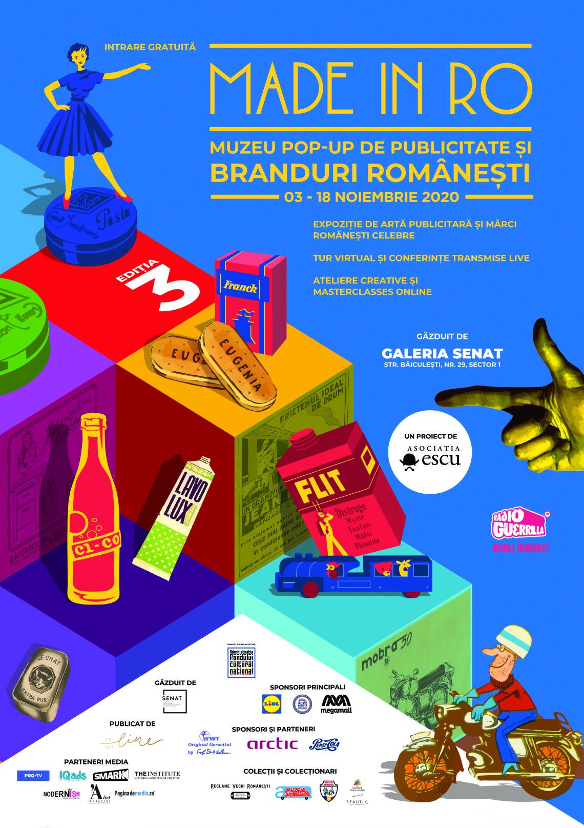 A treia ediție a Made in RO: muzeu pop-up de publicitate și branduri românești are loc între 3-18 noiembrie, cu principala destinație la Galeria Senat (Combinatul Fondului Plastic, str. Băiculești nr. 29, sector 1), un spațiu industrial reconvertit creativ pentru scena culturală din București. Vă