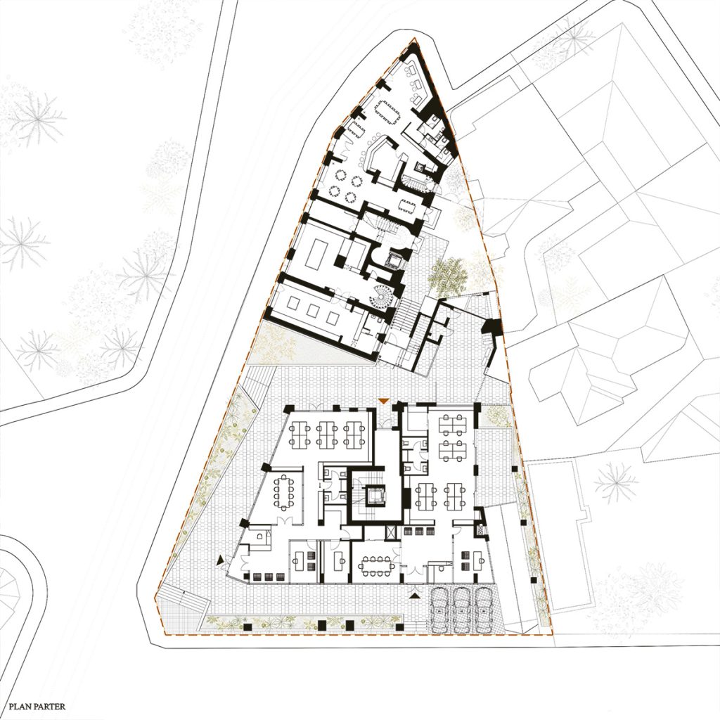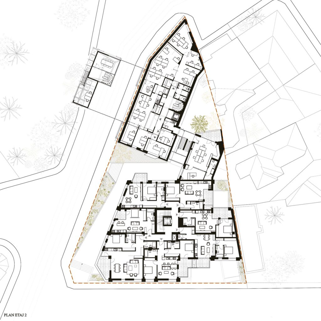 În ceea ce privește spațiile exterioare, volumul noii clădiri abordează diferite modalități de intimizare și filtrare a trecerii către spațiul public al străzii. Fie că este un portic, o terasă la o cotă diferită sau o limită vegetală creată prin amplasarea unor jardiniere, aceste elemente tampon reușesc să medieze raportul dintre public și privat.