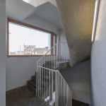 The stairwell relies on the encounter between the white parietal body, delicately textured by the ceramic plating that defines the vertical contour of this space, and the robust image of the concrete of the stairs. The metal railing formed by double stair pillars and cylindrical tubes, of constant section, is also continued in the corridors, and its white image is well integrated into the environment. Light fixtures in the form of simple fluorescent tubes or LED-type lighting are installed in parallel with the stairs.