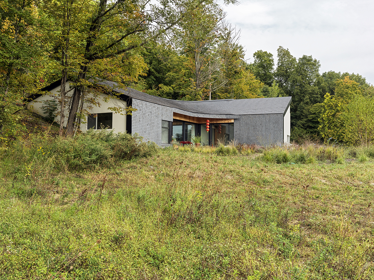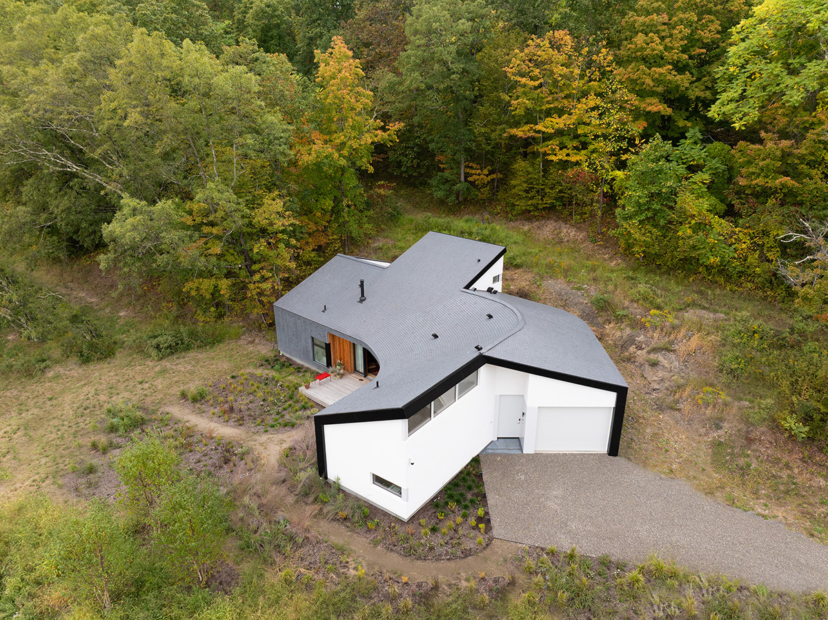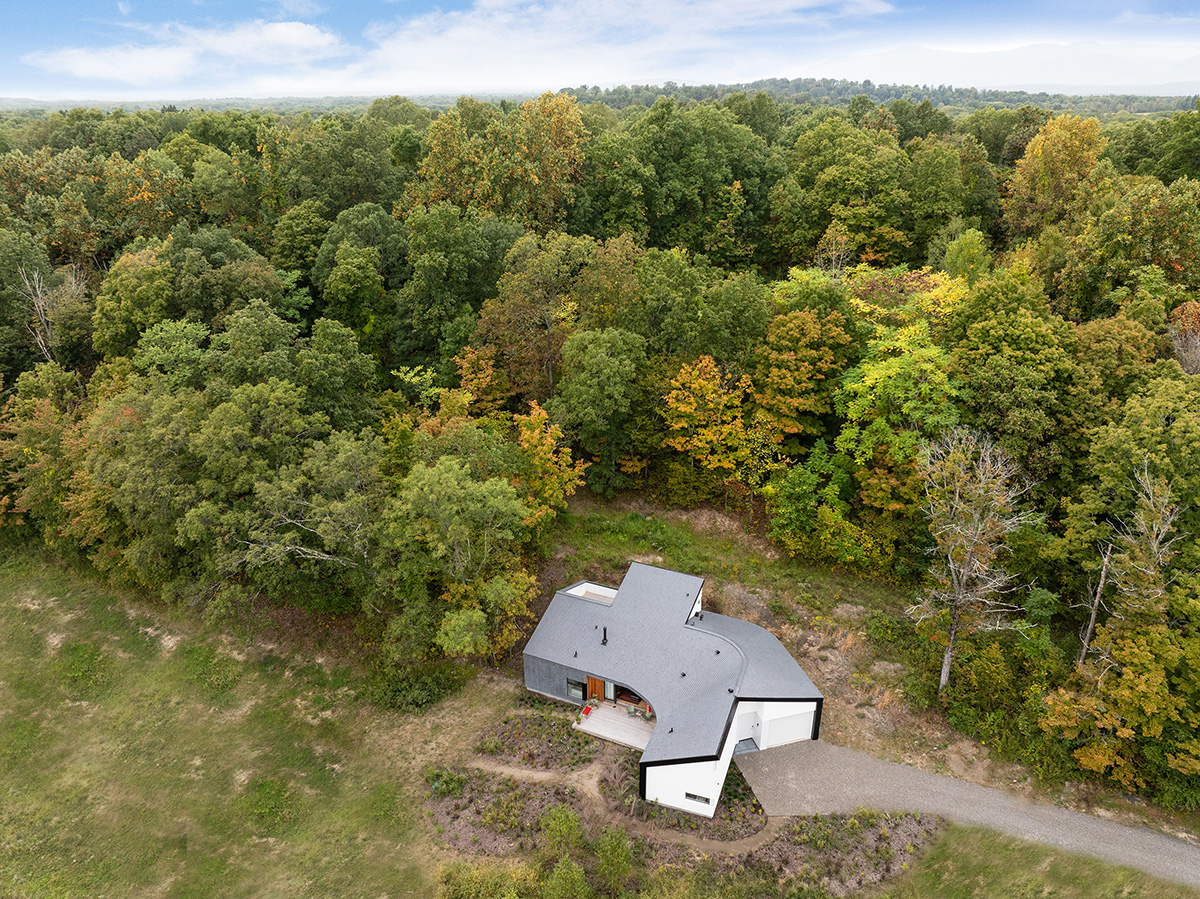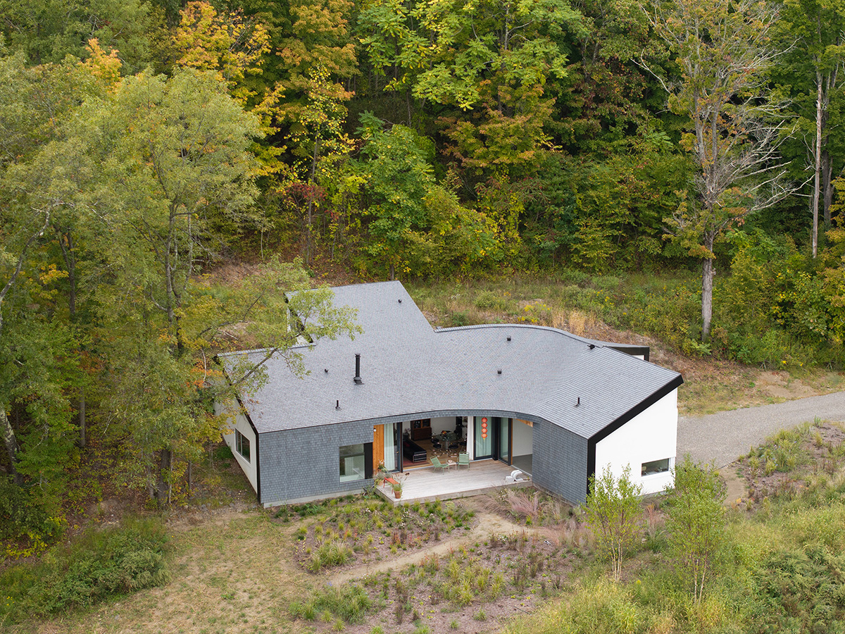 Imaginea aparte a casei rezultă din îndoirea, sculptarea și înclinarea strategică a formei tipice a hambarului. Șindrila din lemn de cedru vopsită într-o nuanță închisă, folosită pentru placarea pereților exteriori și a acoperișului, conferă locuinței un aspect natural, texturat, în armonie cu peisajul înconjurător. Elementele de beton turnat de la capetele structurii sunt retrase, pentru a păstra silueta recognoscibilă de hambar.