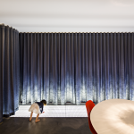 The vertical atrium also acts as a thermal chimney that regulates heating and cooling cycles through cross-ventilation and the use of thermal mass in the floors.