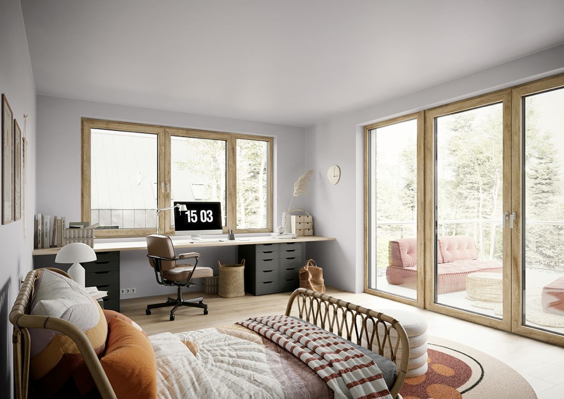 Pentru astfel de amenajări interioare, REHAU Window Solutions pune la dispoziție programul KALEIDO COLOR, care oferă o gamă largă de variante de culoare și design pentru ferestrele din portofoliul REHAU. Astfel, puteți alege cea mai potrivită variantă din opțiunile KALEIDO COVER (placarea cu aluminiu combină aspectul vizual nobil cu avantajele tehnice ale ferestrelor din PVC), KALEIDO WOODEC (aspect vizual și tactil impresionant de lemn cu un finisaj mat și impregnare deosebit de profundă), KALEIDO FOIL (folia de bază oferă culoarea dorită, iar stratul superior transparent protejează împotriva deteriorării și a influențelor mediului) sau KALEIDO PAINT (lac elegant, pe bază de apă, cu un finisaj neted sau texturat în peste 2000 de culori).