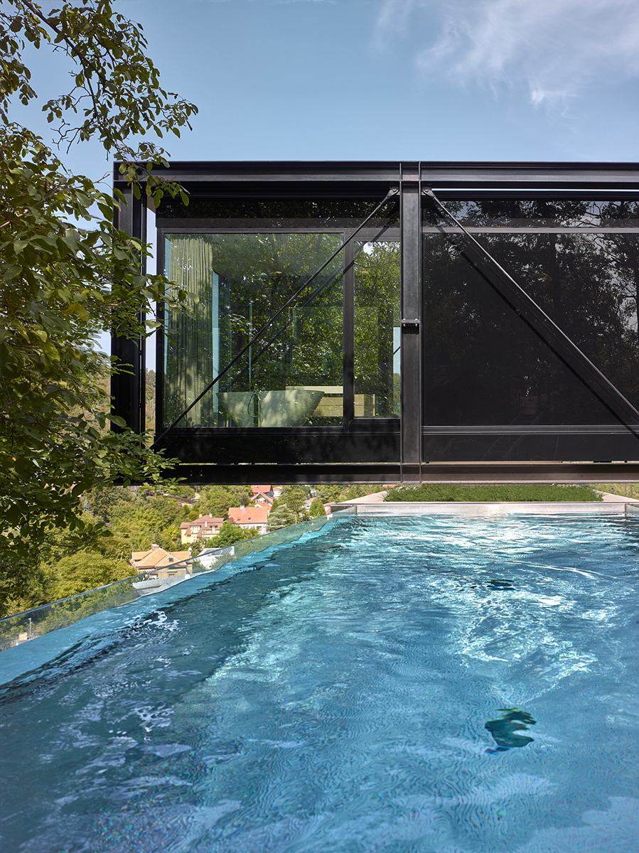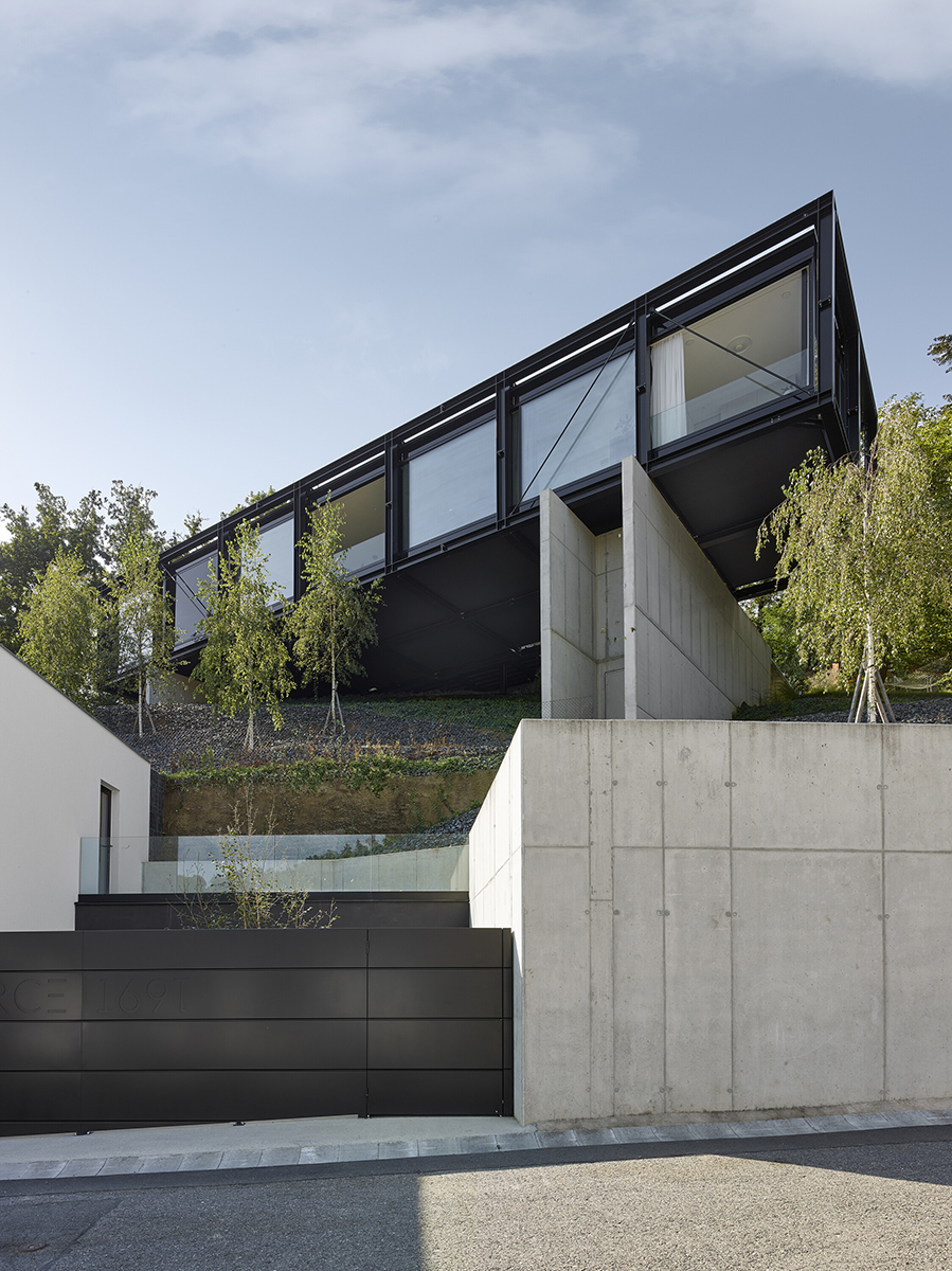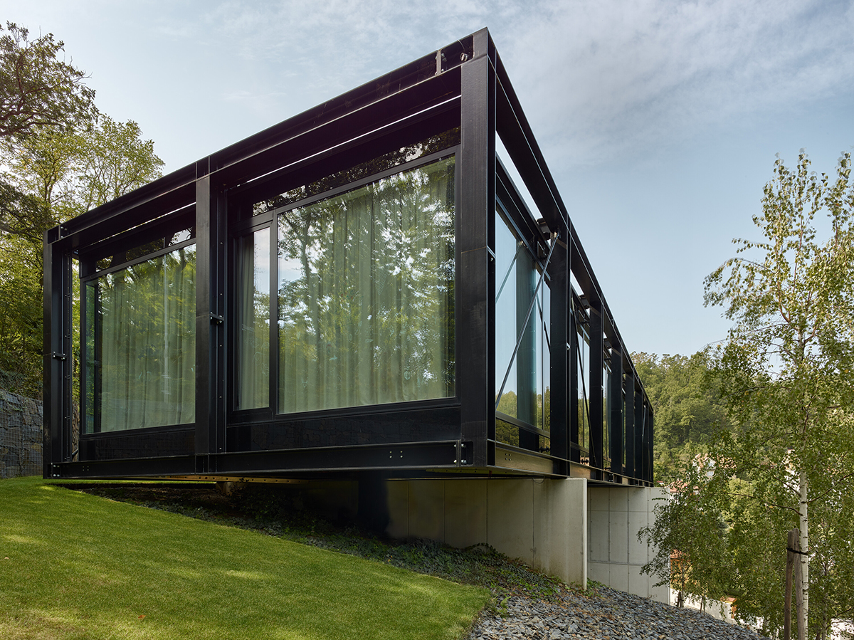Situată în partea de nord a cartierului, noua construcție ocupă un sit abrupt, sursă de provocări, dar și de avantaje, cel mai mare dintre acestea din urmă fiind priveliștile spectaculoase asupra peisajului înconjurător și a orașului Praga, în fundal. Prin urmare, arhitecții au încercat să aducă aceste priveliști în toate spațiile de locuit, din cel mai bun unghi posibil. În ceea ce privește dezavantajele, versantul nordic suferea de o lipsă de soare, acesta strălucind, în cea mai mare parte a zilei, doar în partea cea mai înaltă, greu accesibilă, a proprietății. Arhitecții s-au întrebat, astfel, cum să construiască locuința cât mai sus posibil pe proprietate, asigurându-se, în același timp, că ea va putea fi ușor accesată. Soluția găsită s-a bazat pe conceptul de casă suspendată, forma „câștigătoare” fiind o structură asemănătoare unui pod susținut de stâlpi. Locuința seamănă, astfel, cu o pasarelă de oțel amplasată pe o pantă abruptă, unde a fost rotită pentru a se orienta către priveliștile de la nord, și a profita cât mai mult de soarele de la sud.
