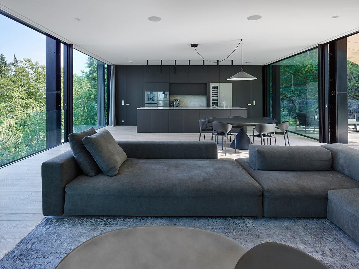 Interiorul este accesibil din garaj – care găzduiește și un studio și o zonă de fitness – prin intermediul unui tunel ce conduce la baza unuia dintre stâlpi, de unde un lift urcă spre spațiile de locuit, oferind și o oprire intermediară, pentru acces la camera de serviciu. Inima locuinței este o generoasă zonă de zi tip open-space, cu mobilier încastrat realizat special pentru acest proiect, formată din living, bucătărie și dining. De aici, se poate accesa terasa orientată spre sud, care leagă vila de terenul cu vegetație și partea superioară însorită a grădinii cu piscină. Părțile proeminente ale „podului” conțin cele două zone de noapte – de o parte, camerele copiilor, și, de cealaltă, dormitorul matrimonial cu baie și vedere către primele.