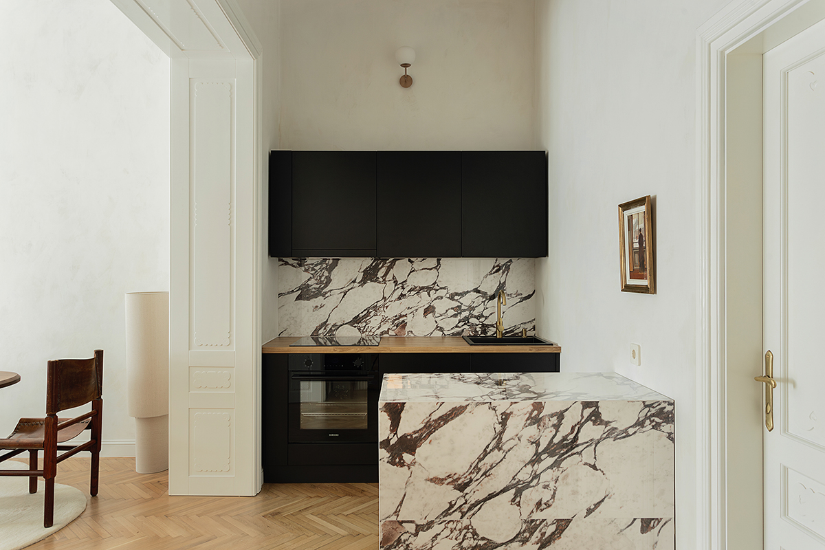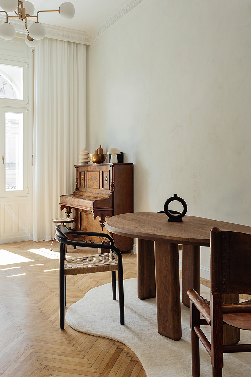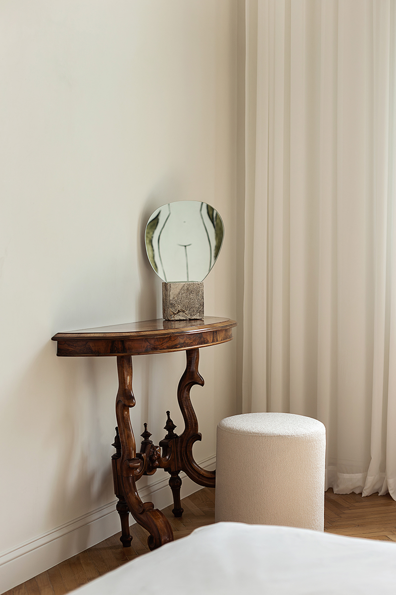 Pentru a nu afecta atmosfera elegantă, nostalgică a apartamentului, arhitecții au renunțat la ideea instalării unui televizor, optând, în schimb, pentru un videoproiector – o soluție discretă ce menține echilibrul vizual al spațiului și aduce tehnologia modernă în spațiu fără a compromite armonia interiorului. În contrast cu deschiderea din zona de zi, dormitorul principal și baia adiacentă sunt tratate ca spații intime, orientate spre vest, captând lumina după-amiezii.