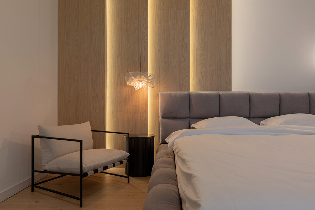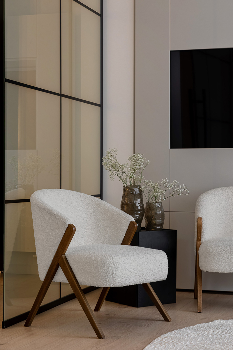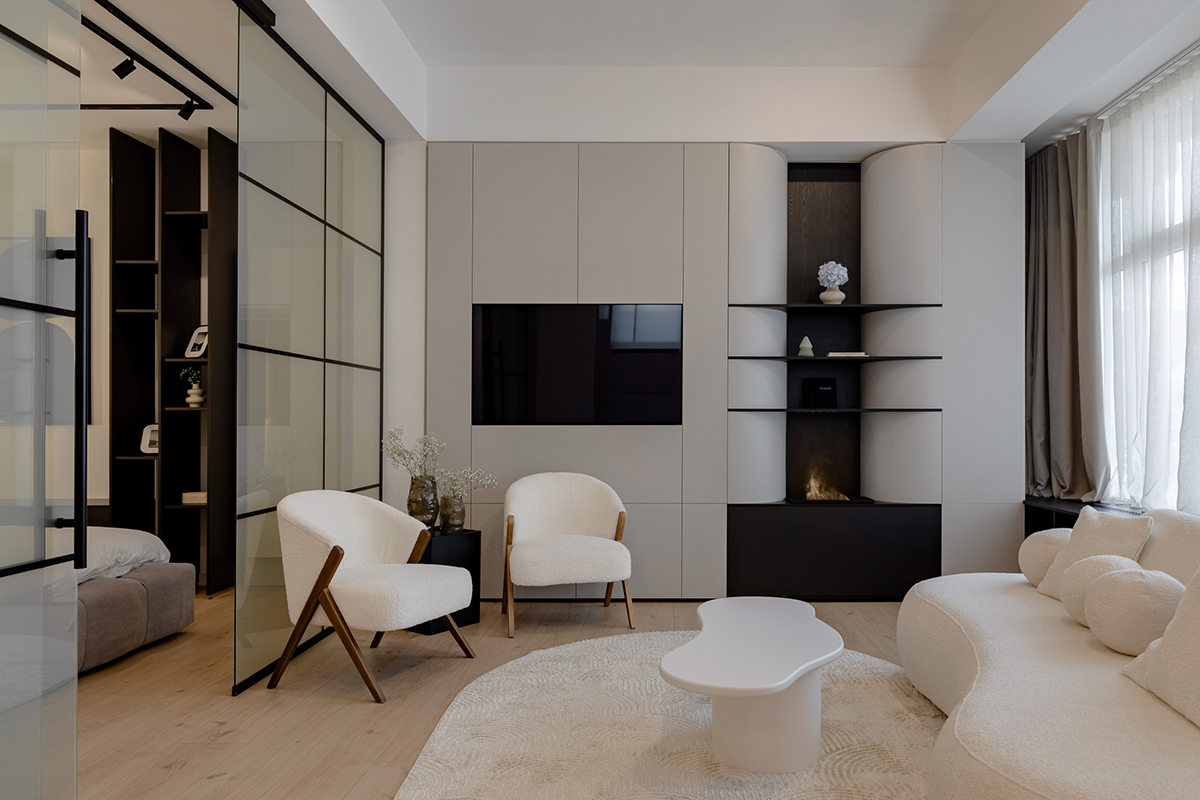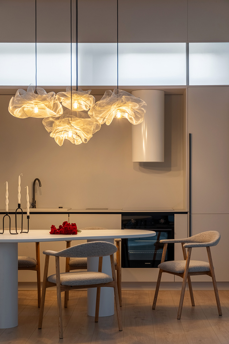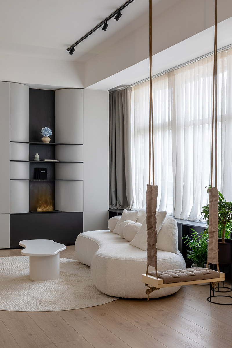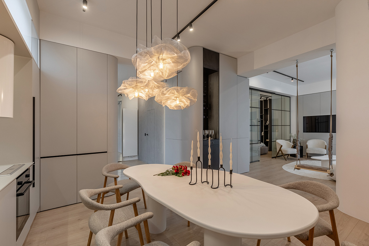 Un alt element unificator important al amenajării este paleta cromatică deschisă, presărată cu accente subtile de negru pentru a crea un contrast elegant și contemporan. Liniile curbe și texturile confortabile sporesc atmosfera de liniște și relaxare. Corpurile de iluminat suspendate, de inspirație japoneză, aduc o notă de farmec wabi-sabi, iar leagănul suspendat din living adaugă un binevenit accent ludic. Toate contribuie la definirea unui mediu fluid și aerisit, unde funcționalitatea, estetica și bucuria de a locui se împletesc firesc, iar lumina devine protagonistul absolut.