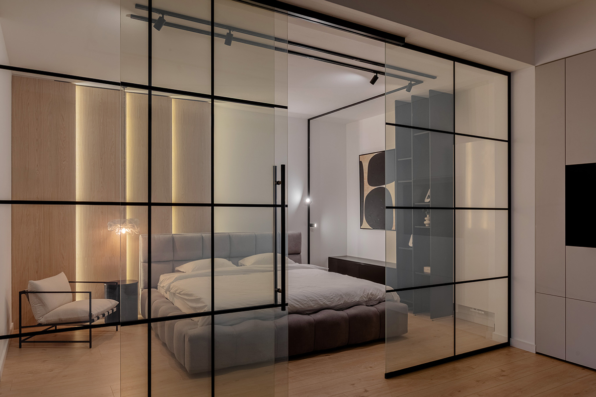 Pentru a permite luminii soarelui să pătrundă nestingherită în interior și a menține continuitatea și fluiditatea ansamblului, arhitecții au găsit o soluție inedită pentru delimitarea zonei de zi de cea de noapte. Astfel, livingul și dormitorul sunt separate de un perete din sticlă inteligentă, ce se transformă din transparentă în mată la simpla apăsare a unui buton, oferind intimitate fără a sacrifica luminozitatea. În același timp, cadrele metalice adaugă ritm spațiului.