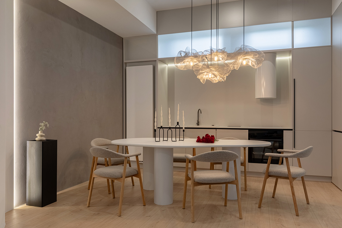 Tot în spiritul păstrării senzației de fluiditate și aerisire, în zona de bucătărie și dining, electrocasnicele sunt încastrate, iar depozitările atent camuflate. Rolul principal revine, aici, mesei de dining, o piesă realizată la comandă, cu o formă neregulată, organică, care devine punctul central al unei scenografii captivante.