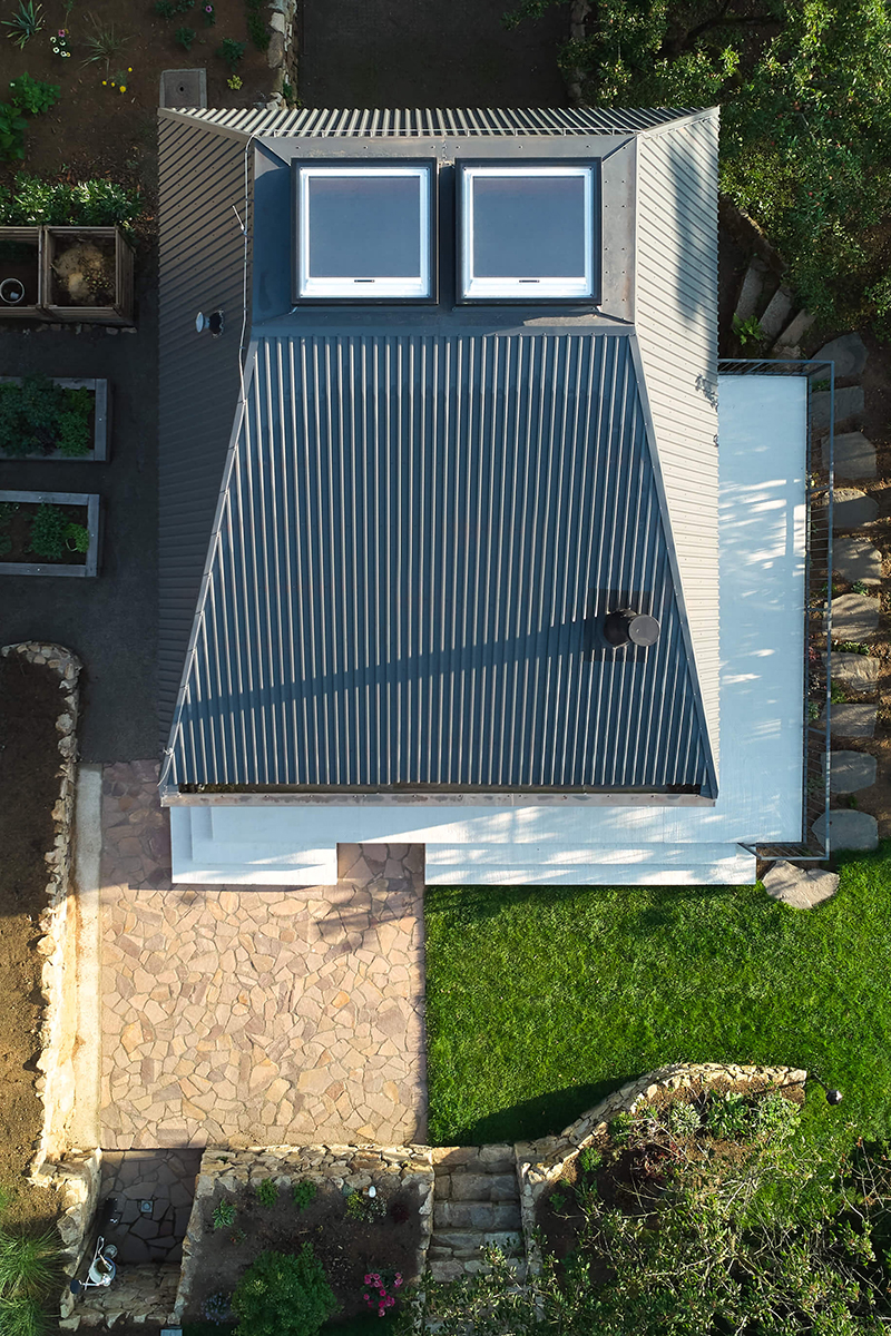 Parterul se deschide spre împrejurimi prin vitraje generoase orientate spre sud și est. Dormitorul amenajat în supantă este iluminat prin cele două luminatoare prevăzute în acoperișul trunchiat, care creează o atmosferă captivantă, meditativă și, în același timp, ajută la ventilarea interiorului, asigurând un mediu plăcut pe tot parcursul anului.