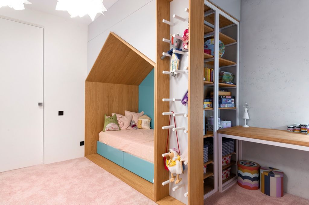 Per ansamblu, apartamentul apare ca o compoziţie de linii simple, nuanţe de alb şi negru, cu finisaje naturale, tonul general fiind întrerupt doar de dormitoarele copiilor, gândite pentru a se potrivi personalităţilor acestora, ca playground-uri colorate, cu texturi variate, calde.