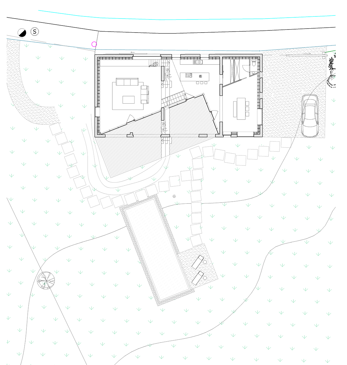 Nu în ultimul rând, amenajarea peisagistică a jucat un rol important în modelarea cadrului, care, prin utilizarea vegetației locale, integrează locuința în peisajul rural înconjurător într-un mod firesc și respectuos. În plus, a fost dezvoltată o soluție ingenioasă și discretă pentru gestionarea excesului de apă de ploaie prin direcționarea sa către un iaz natural unde este purificat și filtrat treptat în sol.