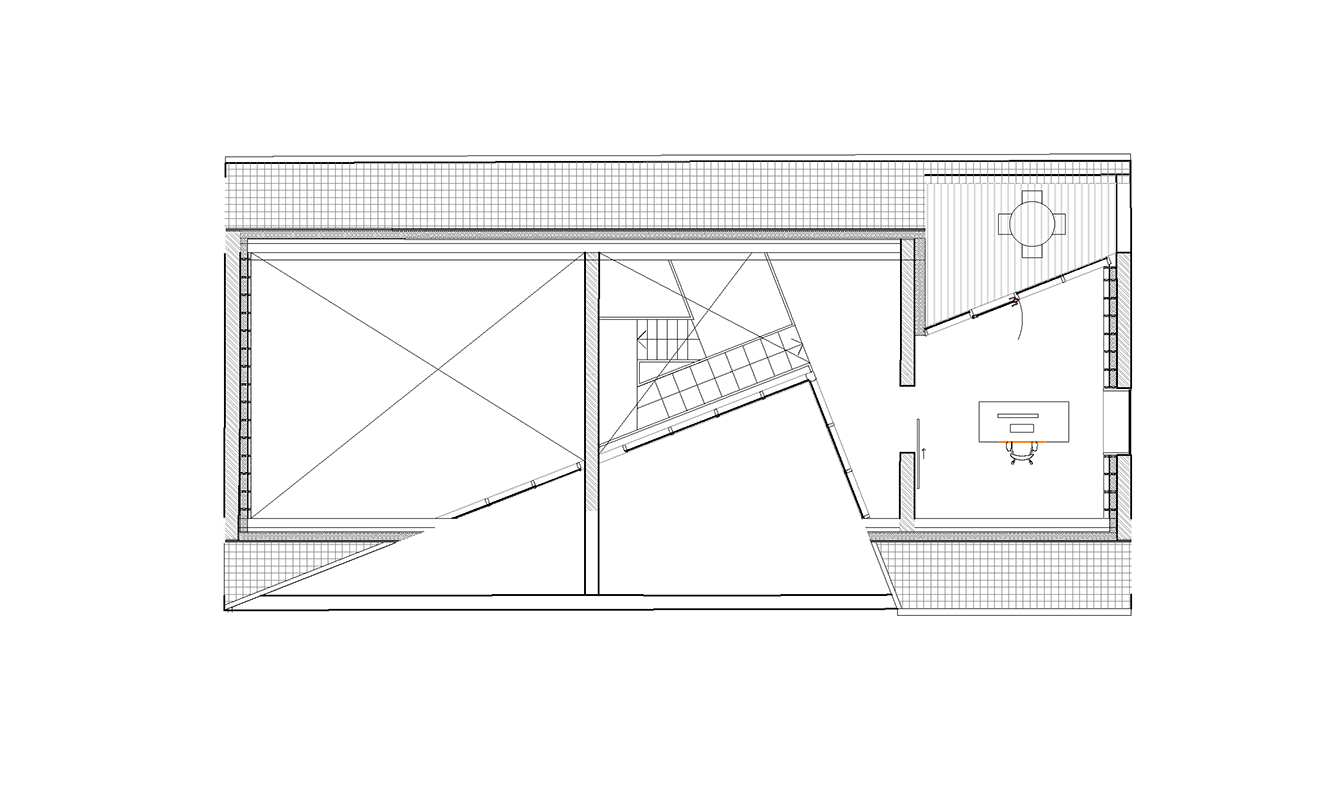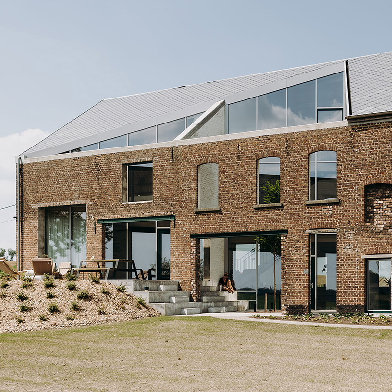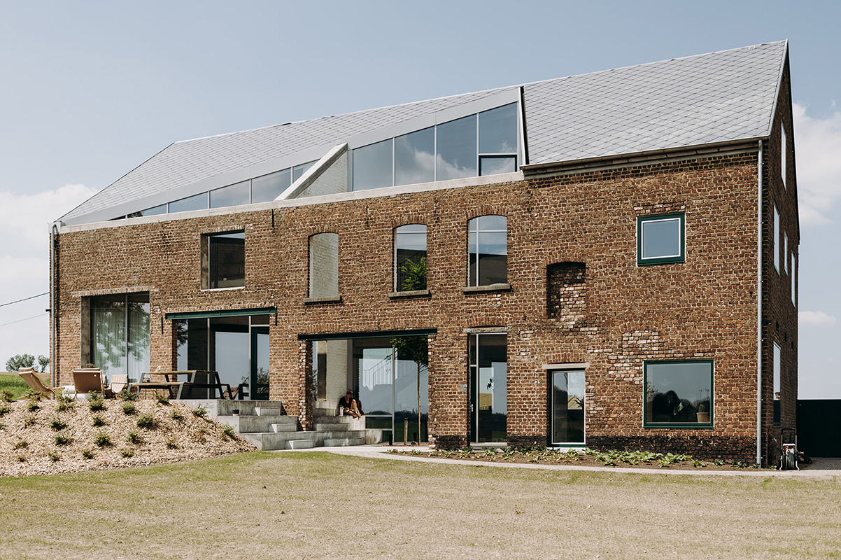 Un vechi hambar abandonat, situat într-un peisaj rural idilic, cu pajiști întinse, în comuna Pepingen, la mică distanță de Bruxelles, a fost transformat într-o locuință contemporană, sustenabilă, cu o suprafață generoasă de 312 mp. Proiectul se remarcă printr-o intervenție arhitecturală particulară – o tăietură triunghiulară în volumul original, formând o curte interioară care inundează casa cu lumină naturală, și stabilind, în același timp, o tranziție fluidă către exterior.