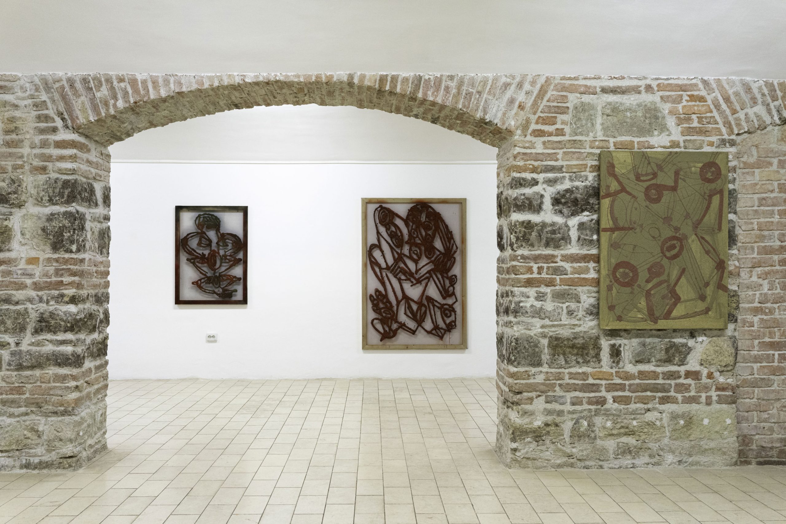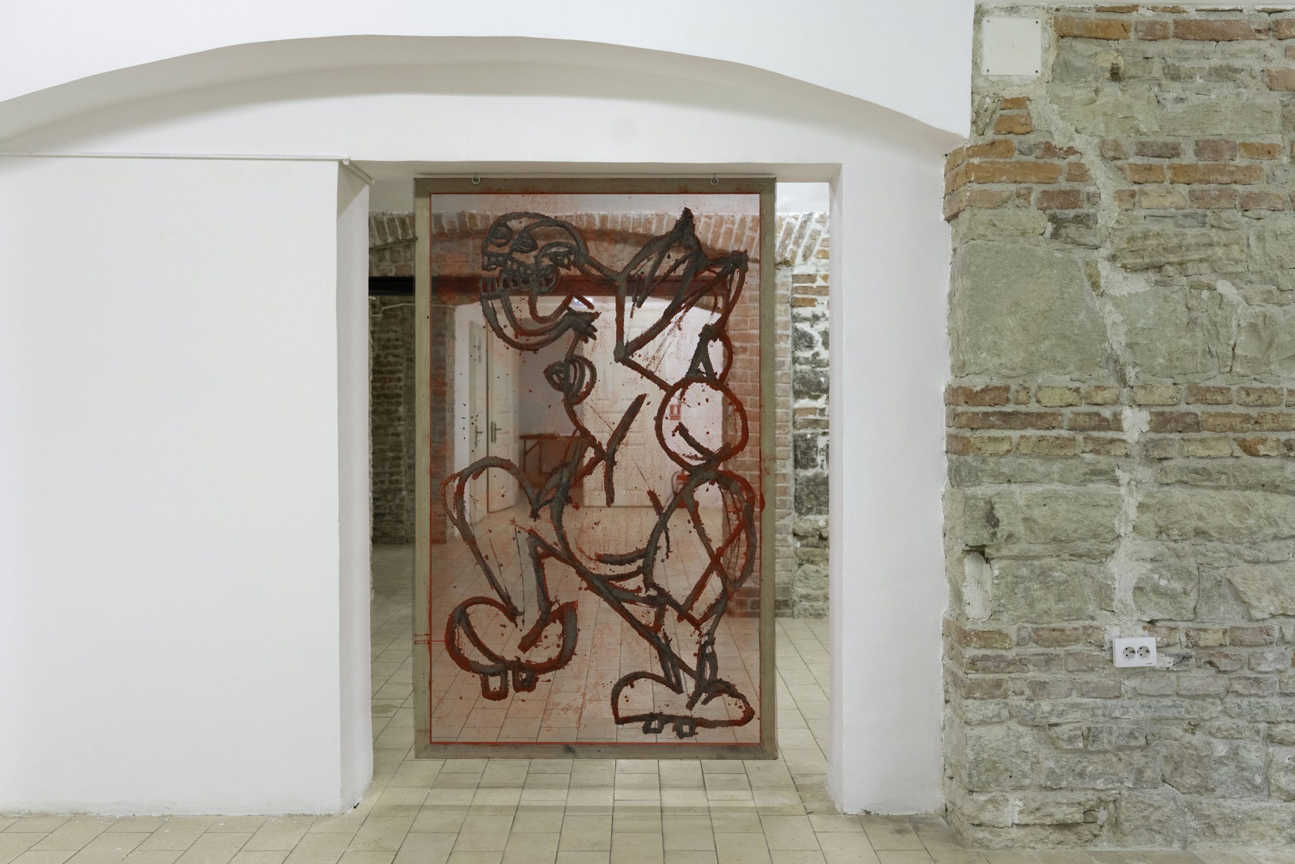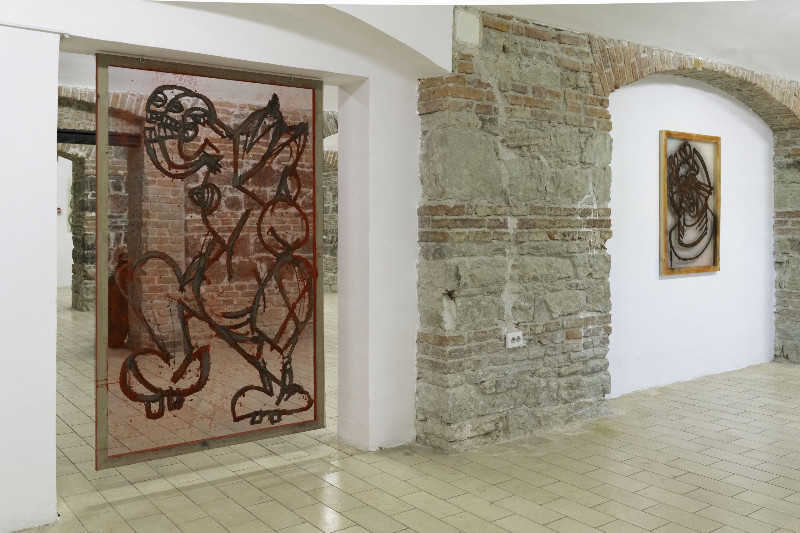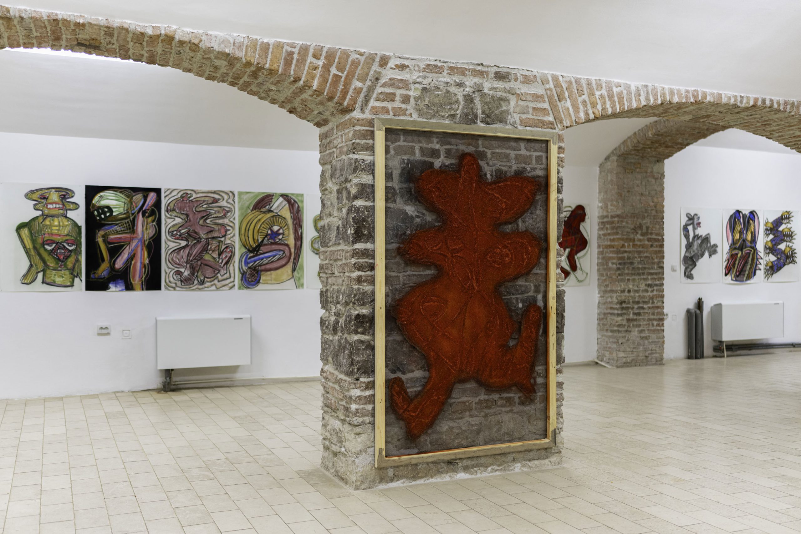 Aproape contra-intuitiv, însă, aceste imagini nu reprezintă schițe, ci mai degrabă semințe ale unor potențialități din viitor. Ele nu formează doar o comunitate bistrițeană de momente și interacțiuni, ci și temelia pentru ce a urmat: formate din ce în ce mai ample, tehnici ce devin tot mai complicate și mai încurcate. Aceste desene reprezintă, deci, un eventual punct de pornire și nu este specific proiectului de la Bistrița, cât mai degrabă unei modalități de lucru ale lui Gorzo, creatorul raportându-se la desenat ca la un instrument de aclimatizare și orientare într-un spațiu încă neîncercat. Astfel, ele sunt mereu supuse unei selecții în baza funcționalității formei și a capacității de a rezista în fața unor dimensiuni mai mari, fiind susținute ulterior de tehnici tot mai diverse; cele de la Bistrița pornind de la creion și trecând prin pastel, tuș, acrilic, pigmenți și multă rășină acrilică, folosită ca un fel de mediu general de asumare a tehnicalității, precum și de conservare a acesteia. Apoteoza dimensiunii, 190 x 120 cm, propune și cea mai recentă tehnică pe care Gorzo a perfecționat-o în curtea Casei cu Lei. Caracterizată prin acumulări de straturi de nisip / talaș de lemn, pigmenți și rășină acrilică, această tehnică permite atât crearea unor obiecte bidimensionale, asemenea unor basoreliefuri sau artefacte arheologice străvechi, cât și așezarea straturilor pe un suport transparent, ce suportă o contemplare duală a privitorului, acesta având ocazia de a vedea din față primul strat, iar din spate, pe ultimul.