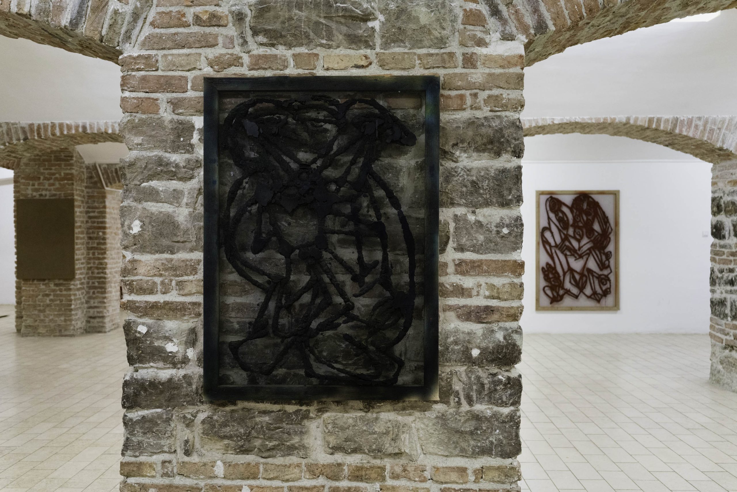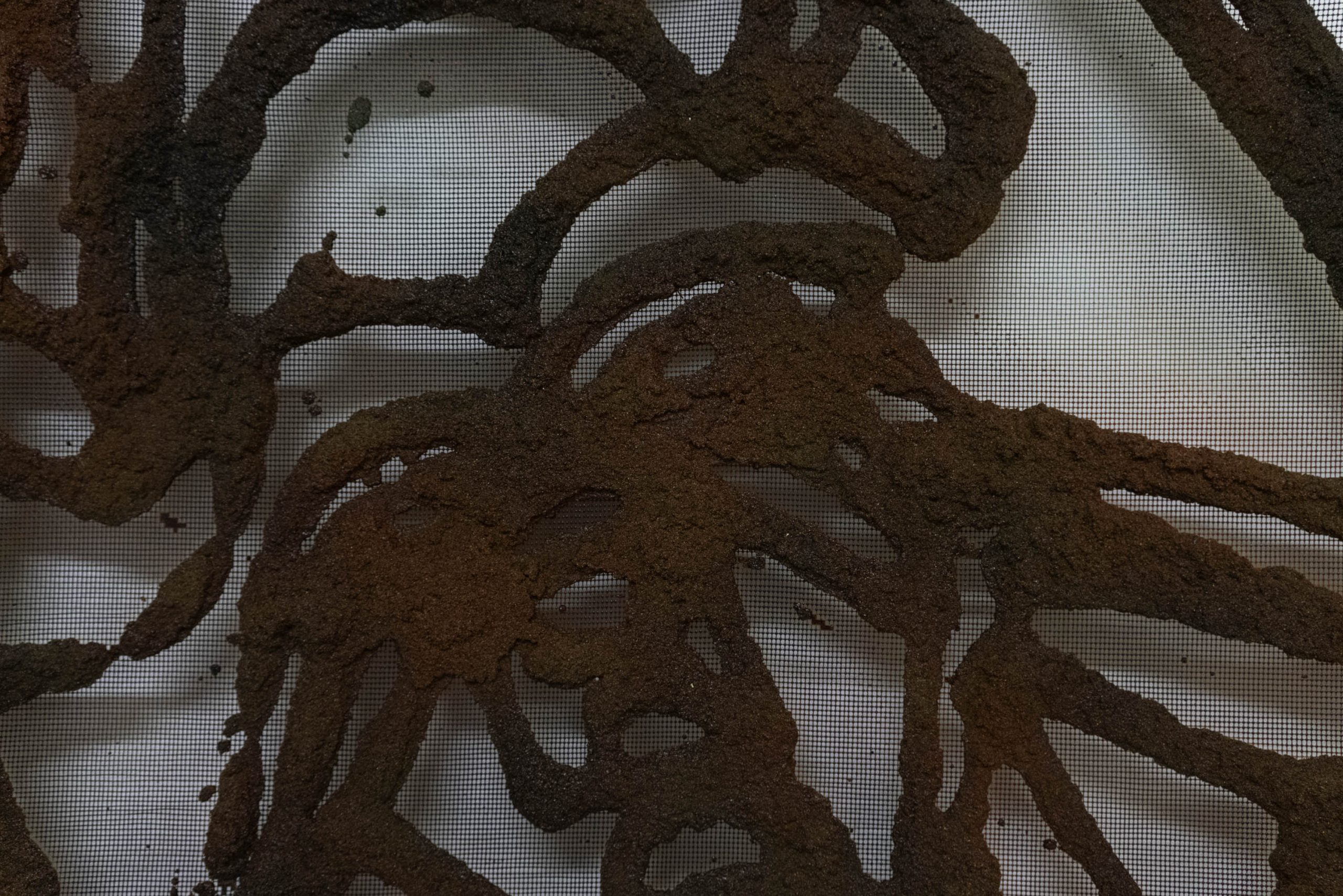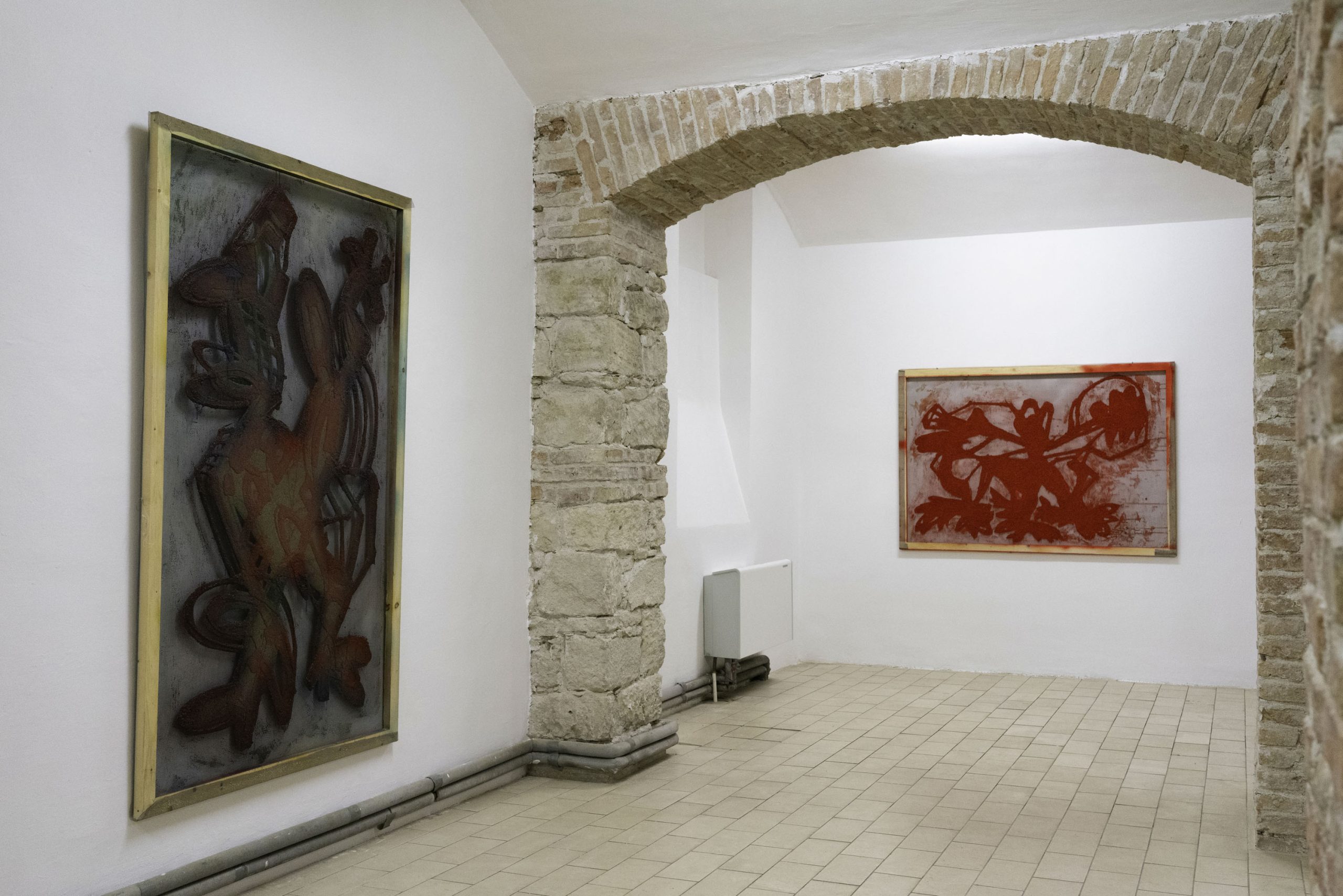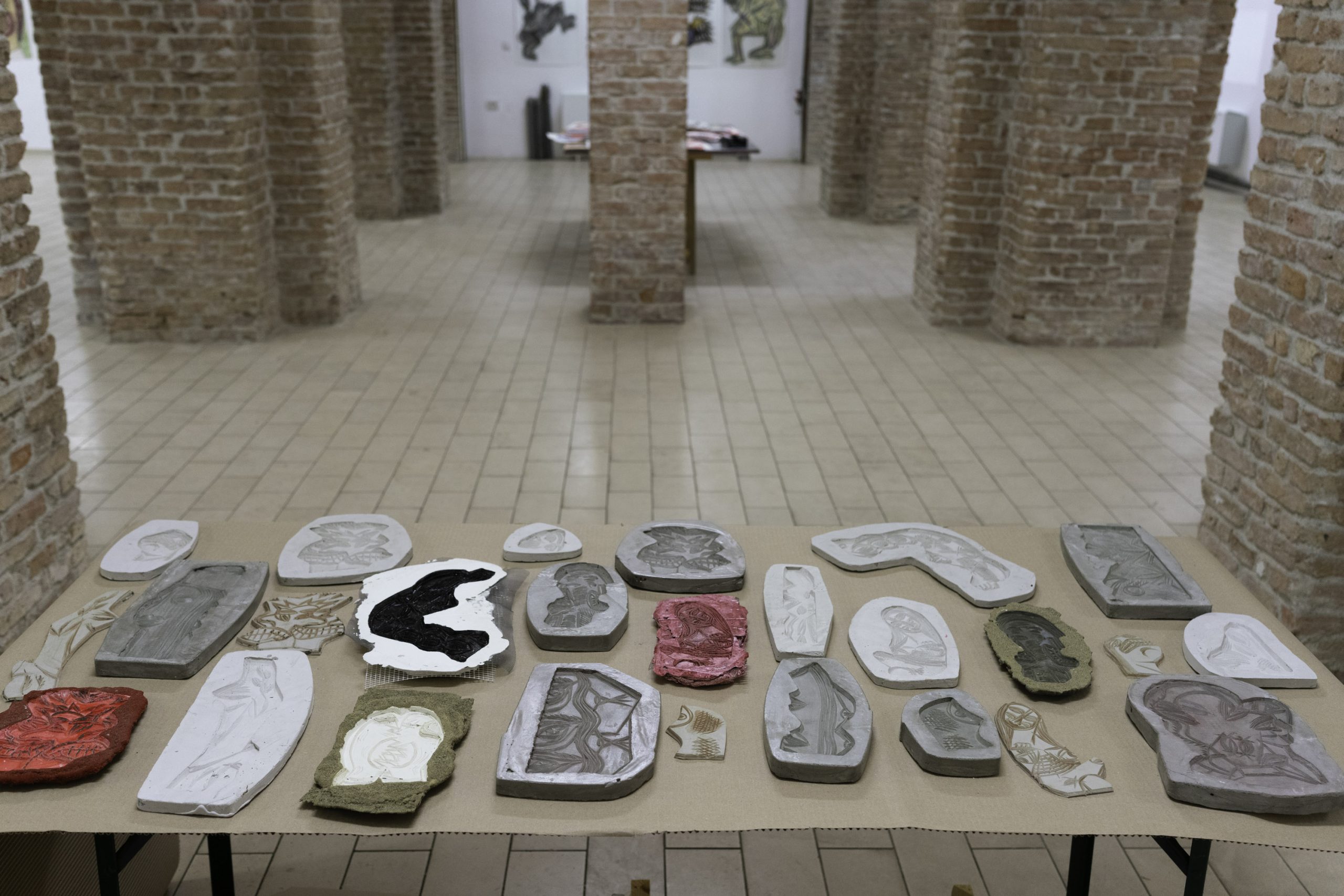 Aproape contra-intuitiv, însă, aceste imagini nu reprezintă schițe, ci mai degrabă semințe ale unor potențialități din viitor. Ele nu formează doar o comunitate bistrițeană de momente și interacțiuni, ci și temelia pentru ce a urmat: formate din ce în ce mai ample, tehnici ce devin tot mai complicate și mai încurcate. Aceste desene reprezintă, deci, un eventual punct de pornire și nu este specific proiectului de la Bistrița, cât mai degrabă unei modalități de lucru ale lui Gorzo, creatorul raportându-se la desenat ca la un instrument de aclimatizare și orientare într-un spațiu încă neîncercat. Astfel, ele sunt mereu supuse unei selecții în baza funcționalității formei și a capacității de a rezista în fața unor dimensiuni mai mari, fiind susținute ulterior de tehnici tot mai diverse; cele de la Bistrița pornind de la creion și trecând prin pastel, tuș, acrilic, pigmenți și multă rășină acrilică, folosită ca un fel de mediu general de asumare a tehnicalității, precum și de conservare a acesteia. Apoteoza dimensiunii, 190 x 120 cm, propune și cea mai recentă tehnică pe care Gorzo a perfecționat-o în curtea Casei cu Lei. Caracterizată prin acumulări de straturi de nisip / talaș de lemn, pigmenți și rășină acrilică, această tehnică permite atât crearea unor obiecte bidimensionale, asemenea unor basoreliefuri sau artefacte arheologice străvechi, cât și așezarea straturilor pe un suport transparent, ce suportă o contemplare duală a privitorului, acesta având ocazia de a vedea din față primul strat, iar din spate, pe ultimul.