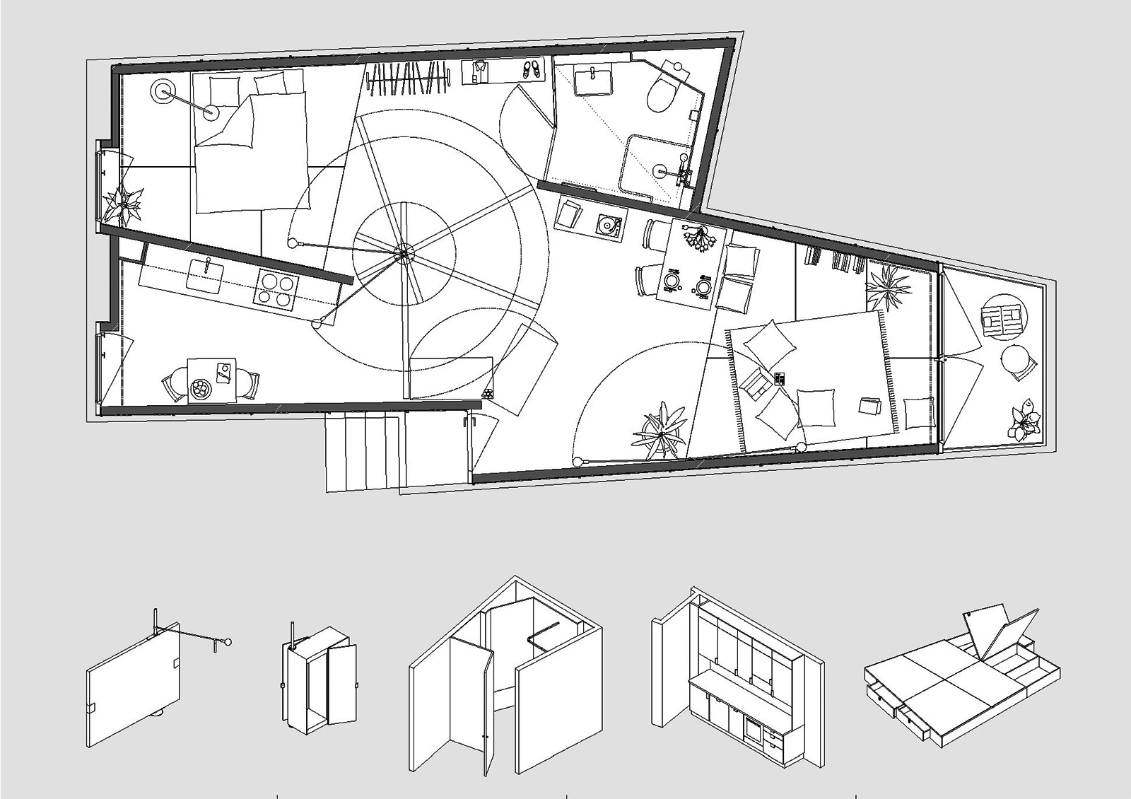 planul apartamentului și axonometrii izometrice ale elementelor spațiale