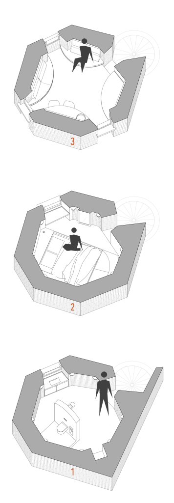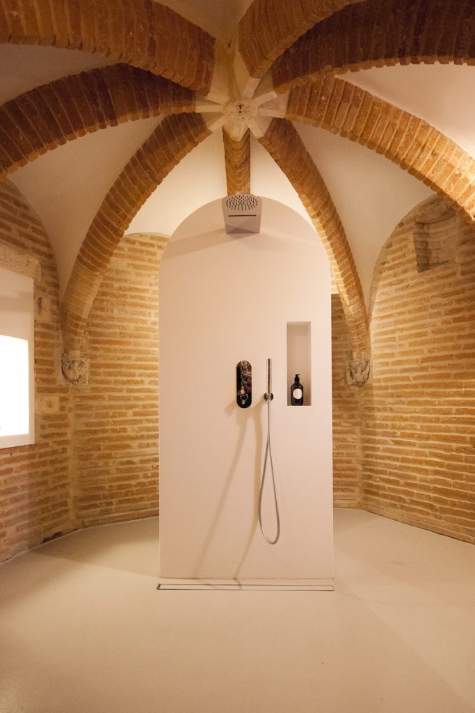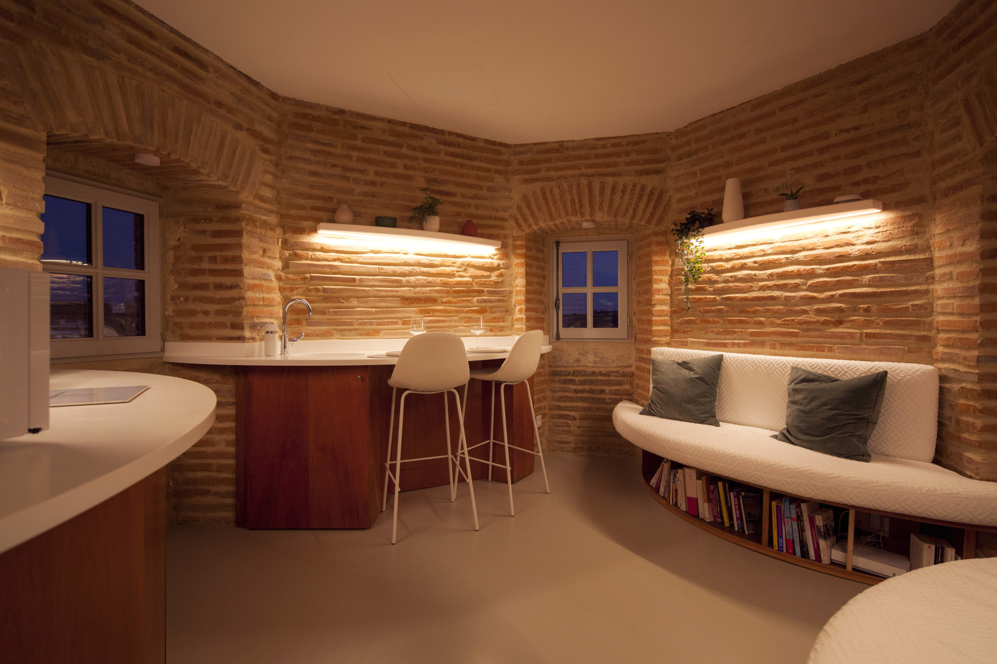 Ultimul nivel propune un mobilier cu design curbat, pentru o integrare fluidă și uniformă în spațiu. De altfel, simplitatea, austeritatea și omogenitatea caracterizează întreaga intervenție, stabilind un subtil dialog între notele contemporane și elementele istorice, între materialele netede, suple și straturile rugoase, vechi ale cărămizii.