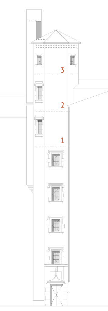 Proiectul de renovare și amenajare a ținut cont de aceste trăsături ale fiecărui micro-spațiu, construind o viziune centripetă pentru primele două etaje – cu un unic punct de interes, în mijloc, pentru a lăsa să se citească astfel forma pereților și a plafonului – și una centrifugă la ultimul etaj, cu accent pe marginile spațiului, pe deschideri și orizont.