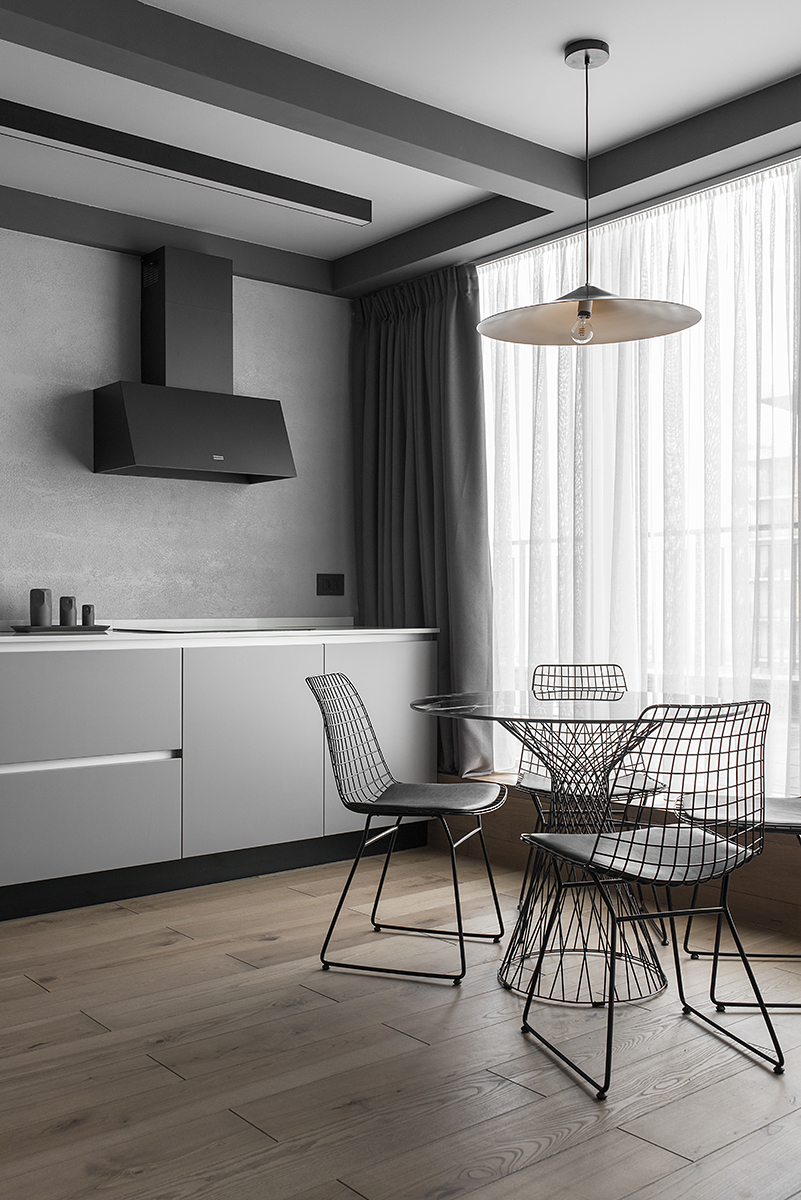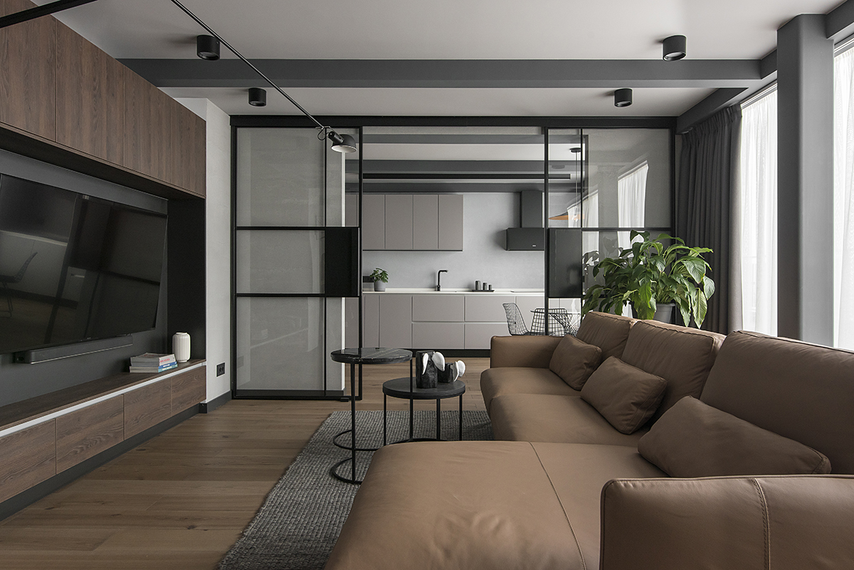În concepția echipei de proiectare, nota cromatica generală este în mod foarte discret și neagresiv industrială, cu trimitere la eleganța minimalistă a interioarelor ansamblului Lake Shore Drive din Chicago, realizat de Mies van der Rohe la jumătatea secolului trecut. Tonurile dominante de gri și maro asigură continuitatea percepției spațiale și identitatea vizuală de fond a apartamentului. Piesele ocazionale de mobilier sau corpurile speciale de iluminat devin, pe acest fundal, accente formale sau de culoare contrastante, într-o notă compozițională mai vibrantă.
